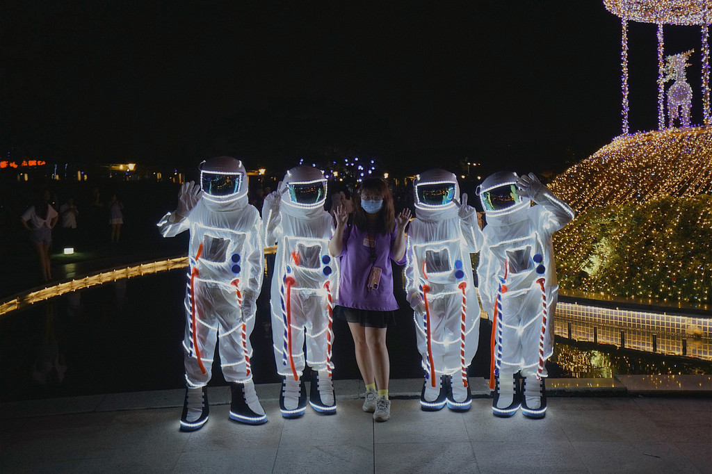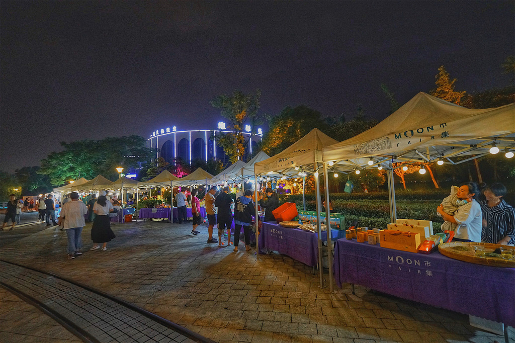 各种各样的灯光艺术在这里展示,还有湖边的夜市小摊