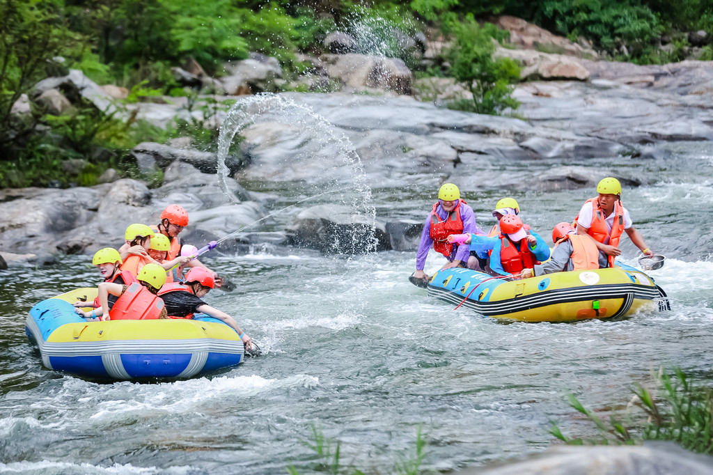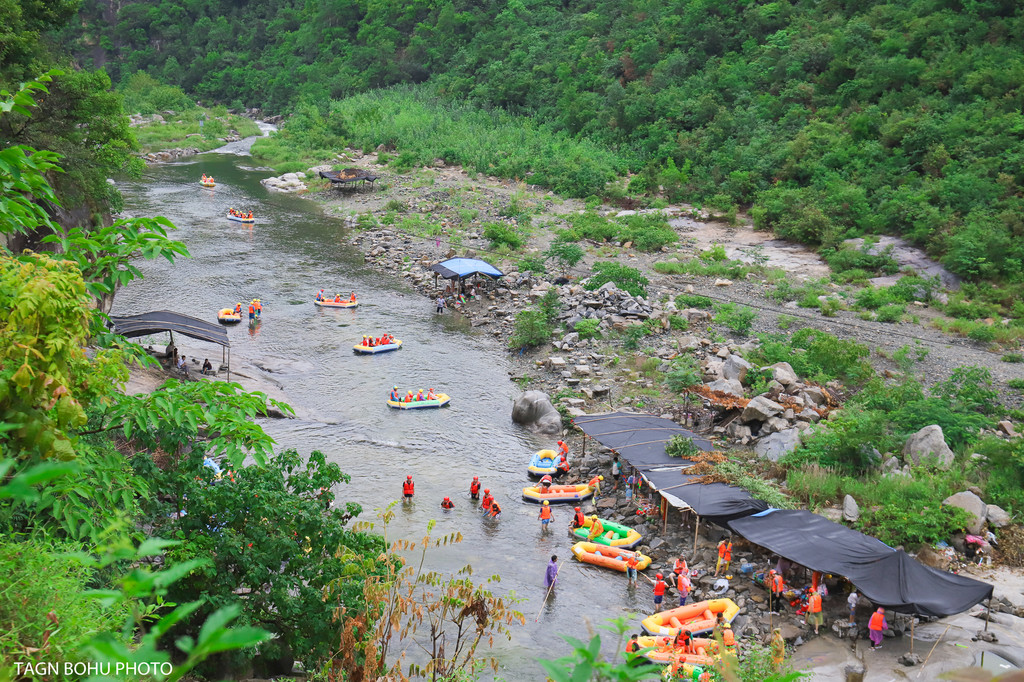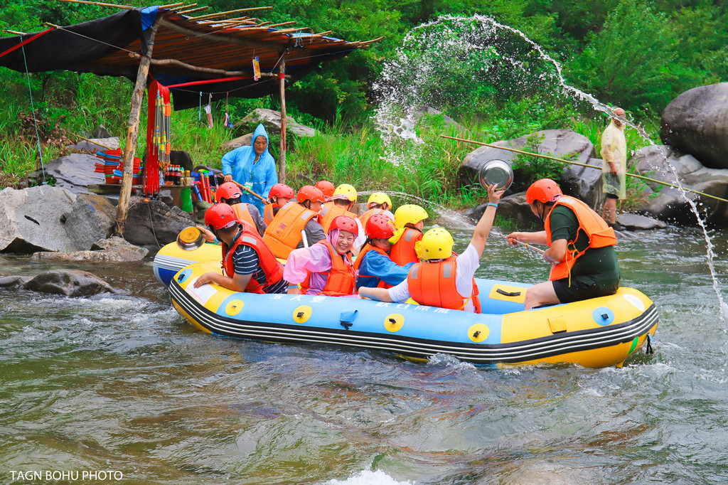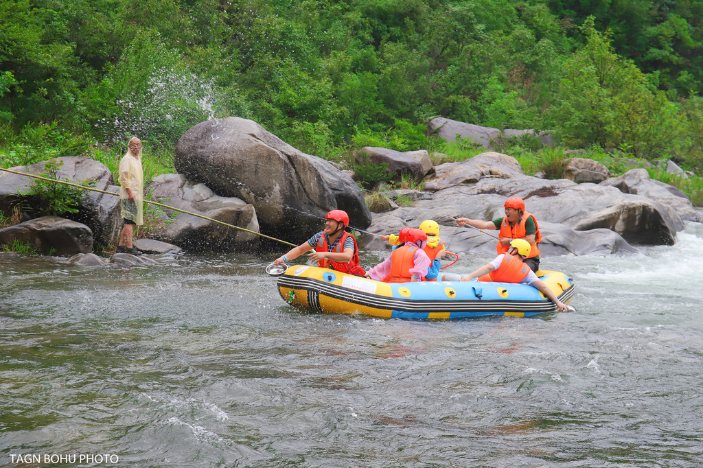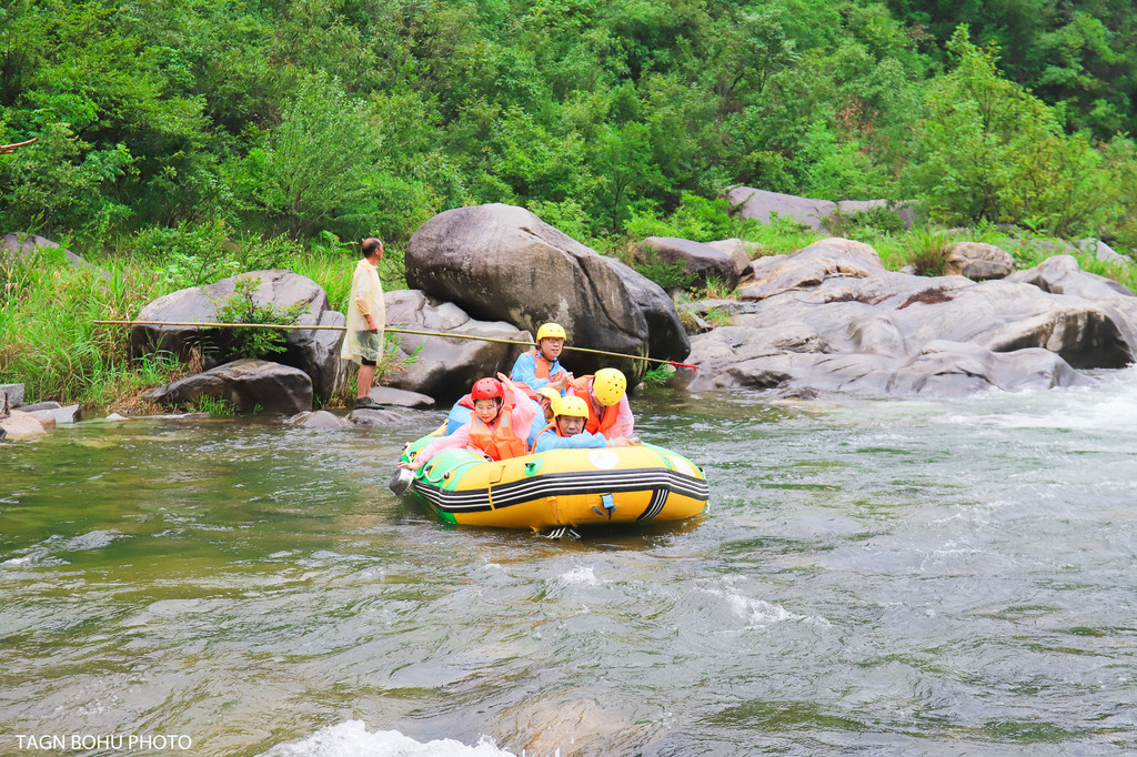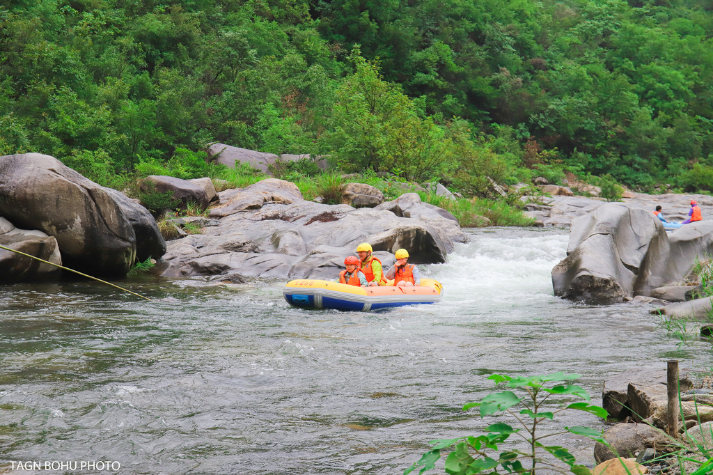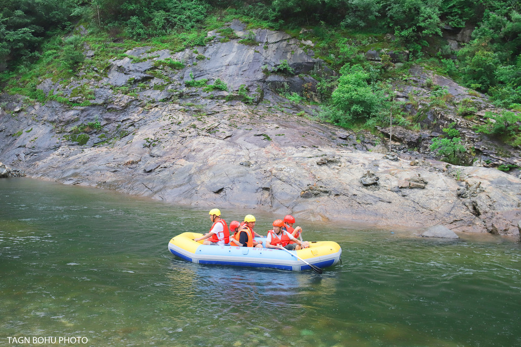 宝天曼峡谷漂流拥有九曲十八弯的漂流河道,是真正的峡谷第一漂。下着小雨,乘坐橡皮艇,从清凉的水花中一跃而过,时而轻盈如燕,时而奔腾如虎,一路漂荡、一路欢叫。