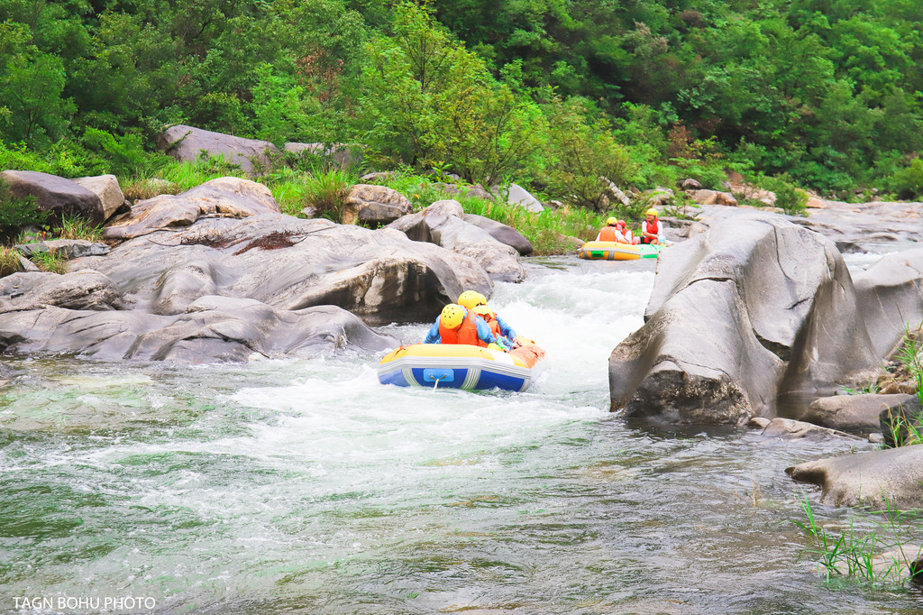 宝天曼峡谷漂流位于南阳市的内乡县,是国内唯一的生态峡谷型漂流。该漂流整体落差有239米,拥有九曲十八弯的漂流河道,是真正的峡谷第一漂。若您喜欢玩水,且不排斥惊险刺激游戏的话,可以到漂流景区玩上一番。下着小雨,乘坐橡皮艇,从清凉的水花中一跃而过,时而轻盈如燕,时而奔腾如虎,一路漂荡、一路欢叫,穿丛林、越河谷、用移动的视角欣赏沿途美景,感受原始峡谷的植被风貌带给你视觉的冲击。绿树茵茵,新鲜自然的空气扑面而来。让肺部感受清新和凉爽。在林海花潮中顺流而下,在山、水、林间体验自然情趣,感受森林漂流带来的别样感受。