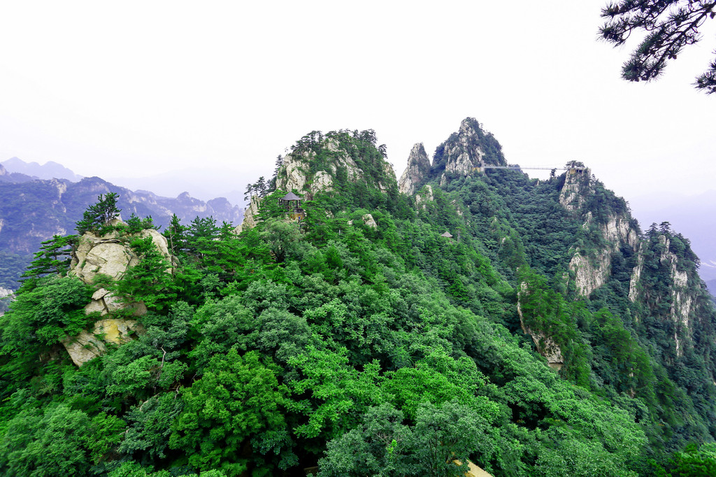 我们第一站从郑州自驾约4个多小时,到达避暑养生地,南阳老界岭。爬到老界岭山顶放眼望去千峰万嶂,重重叠叠,耸入云端,宛如万幅壮锦,从天外飘来。 蜂峦起伏,蜿蜒连编的群山,一座比一座高。 看那远处山顶陡峭的悬崖上有座亭子,亭子下悬崖峭壁 ,崇山峻岭围绕着一个大山,郁郁葱葱和树木,好一幅诗意盎然的水墨画。
