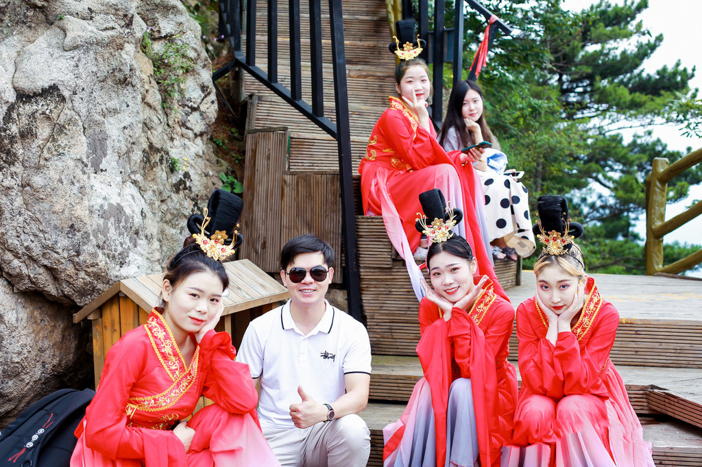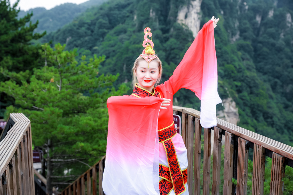 一路上看到有景区的工作人员空着红色长长的服装正在表演着,在木栈道上跳着舞蹈,婀娜多姿的舞姿吸引了游客的注意,我也不例外,凑过去先跟她们合个影再说了。衣服和绿色的森林很塔配,在之崇山峻岭中跳舞,领略老界岭景区的无限魅力。