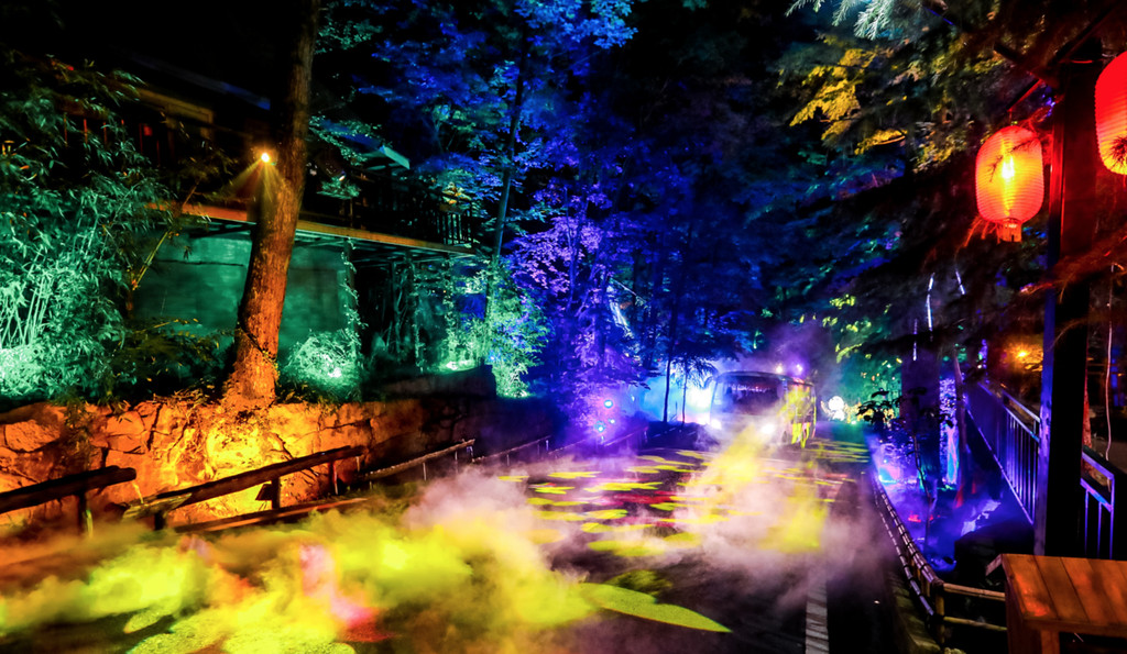 夜晚的老界岭,灯光非常的绚丽,有些地方还自带烟雾特效,仙气缭绕地,好梦幻的。