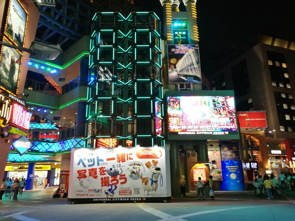 从机场乘坐地铁,直接在影城站下车,从地铁站出来,就能感受到影城的气氛。时间大概日本时间7点钟左右,天已经略黑了,灯光刚好。