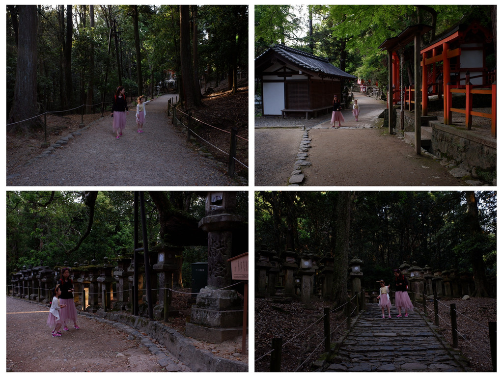 下午,去春日大社,观感极好的一处所在。沿着古旧的石阶,两侧是同样古旧青苔的石灯,一路延申指引着,路上会遇到大小不一的各色神社。