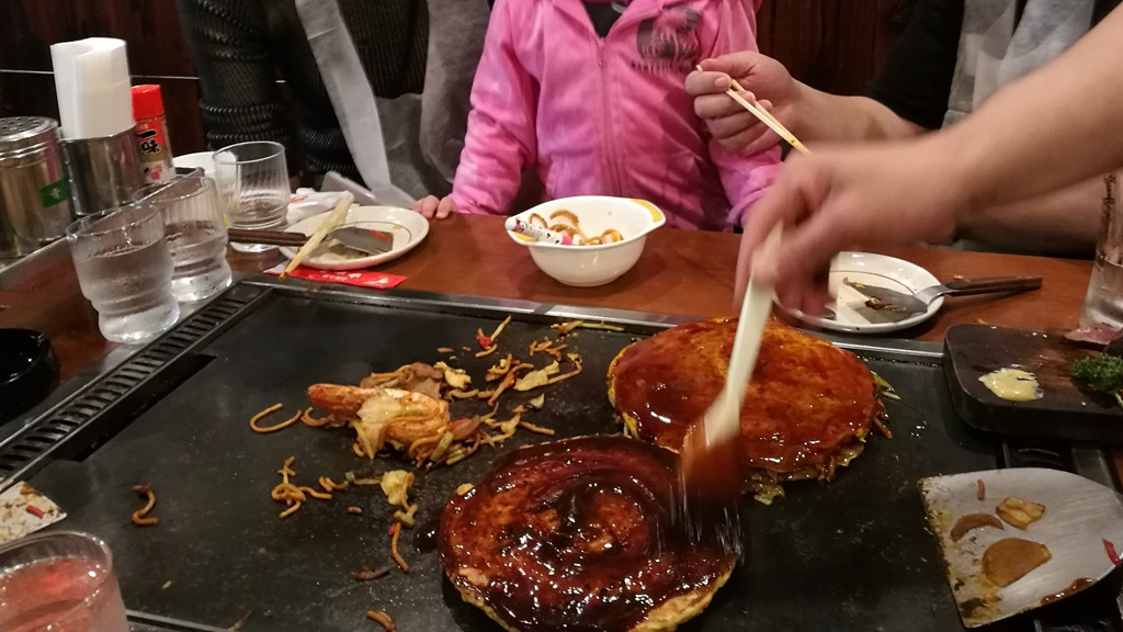 晚饭,吃的是大阪烧。肉、菜、米饭、酱汁,一起在铁板上熟透,味道还算不错。
