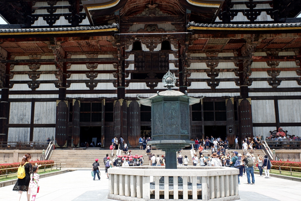 世界文化遗产之一的东大寺,唐代高僧鉴真和尚曾设坛授戒。是日本华严宗大本山,又称为大华严寺、金光明四天王护国寺等。位于平城京(今奈良)东,所以被称作东大寺,大佛殿正面宽度57米,深50米,为世界最大的木造建筑。殿内放置高15米的大佛像卢舍那佛。东大寺院内还有南大门、二月堂、三月堂、正仓院等。南大门有很著名的双体金刚力士像。二月堂能够俯视大佛殿和眺望奈良市区。