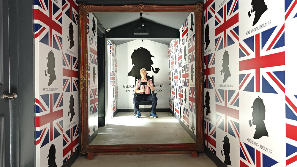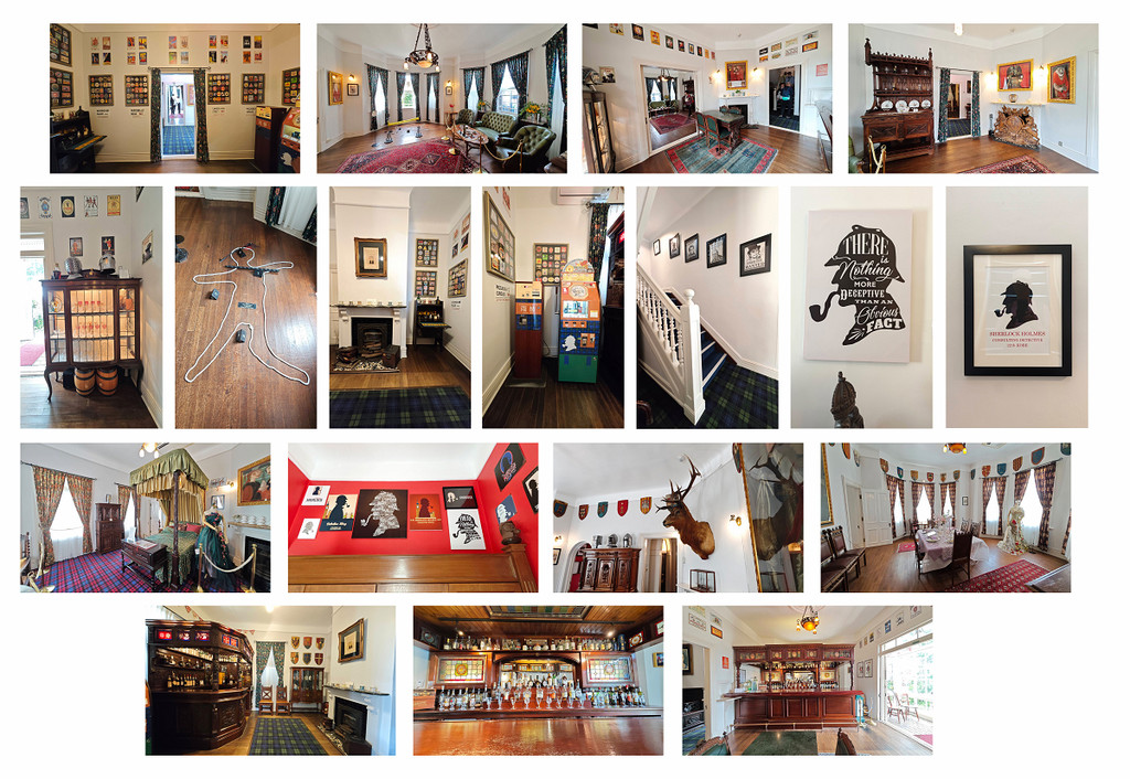 馆内装饰充满了巴洛克和维多利亚时代的风格,英式的花园、酒柜里琳琅满目的世界名酒,还有二楼的福尔摩斯房间再现,剪纸让人流连忘返。花园里还有免费的福尔摩斯服装和道具,可以随意拍照,感觉子瞬间变成了大侦探福尔摩斯。