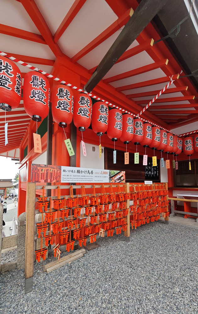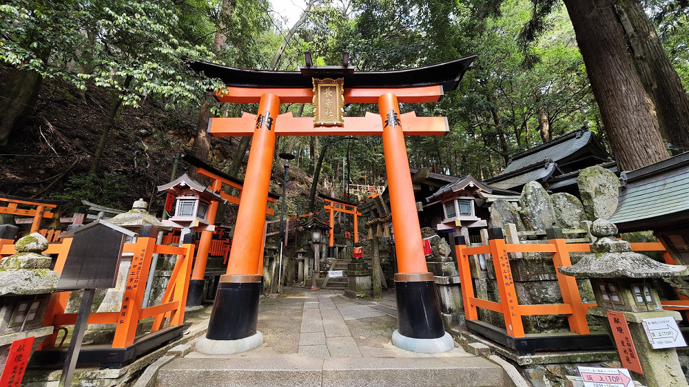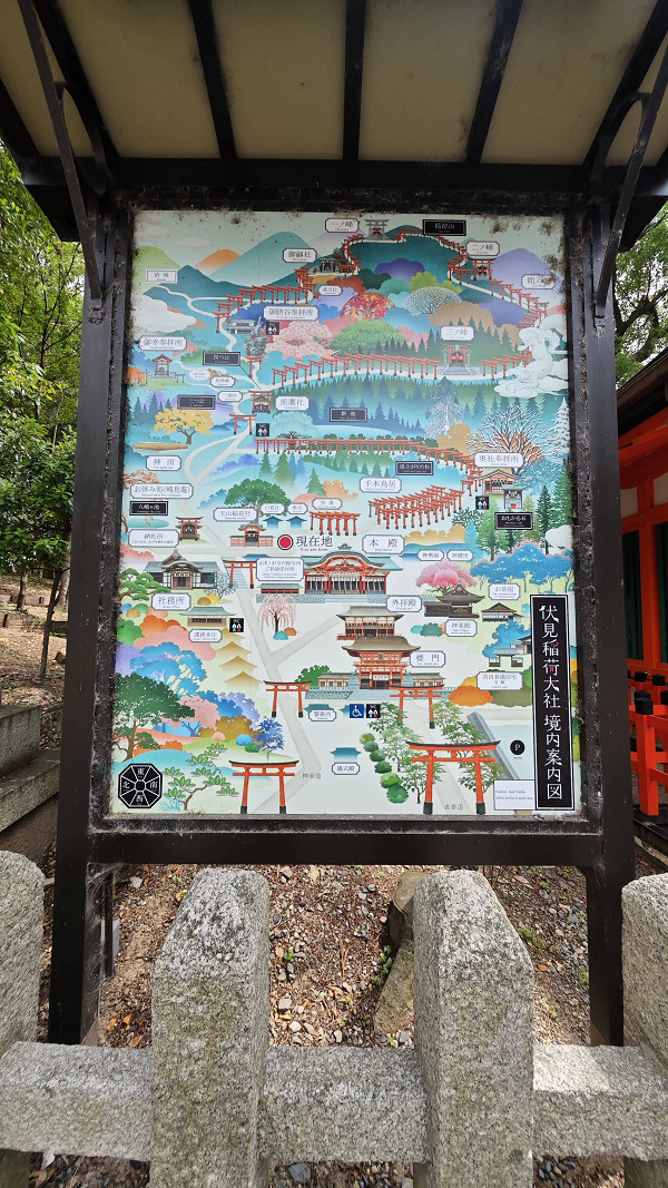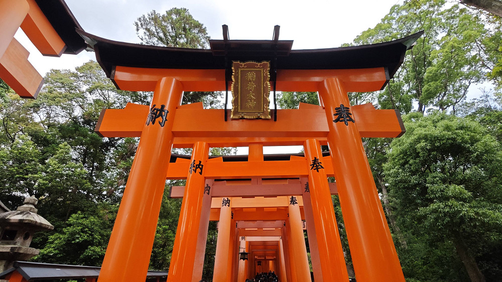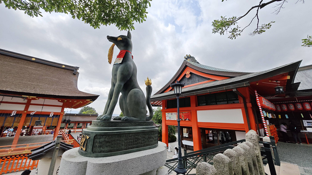 伏见稻荷大社的入口,矗立着由丰臣秀吉于1589年捐赠的大鸟居,后面便是神社的主殿及其他建筑物。在神社里,还能见到各式各样的狐狸石像,这是因为狐狸被视为神明稻荷的使者。狐狸脸形的绘马是这里的一个特色。