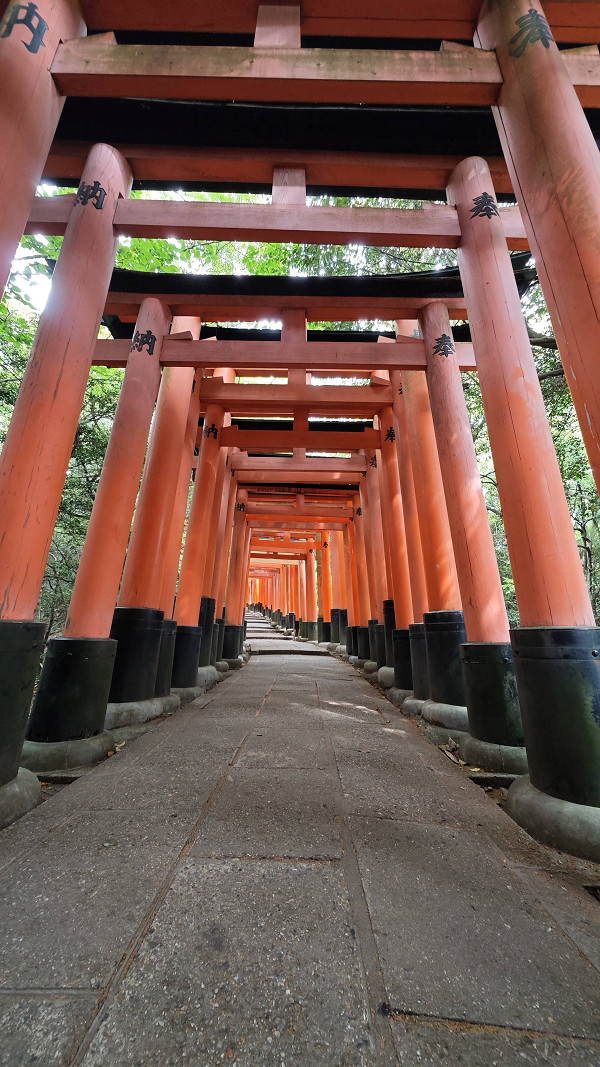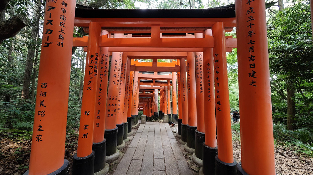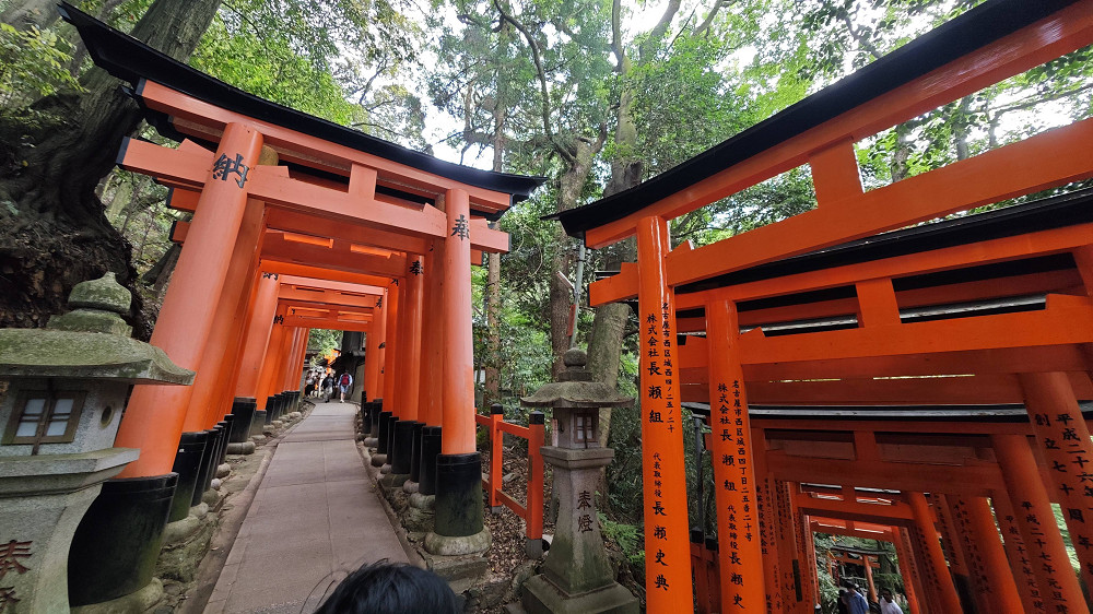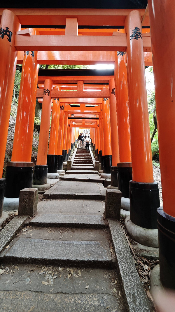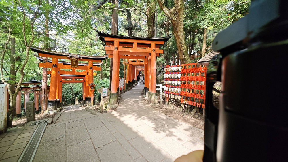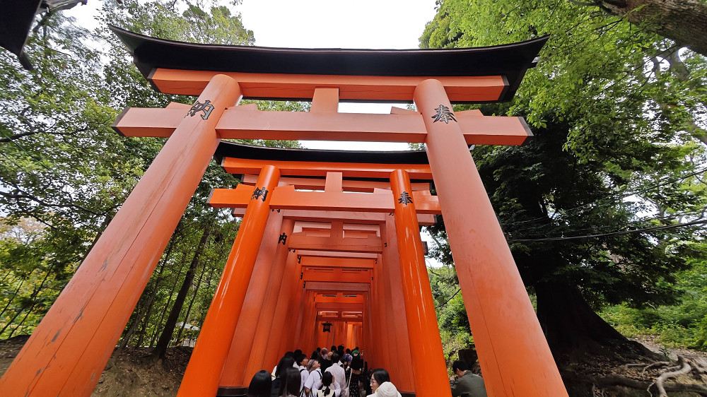 伏见稻荷大社境内最受注目的建物莫过于满布整座山头的各式大小鸟居,被称为「千本鸟居」(“千本”意思是一千座,比喻鸟居数目众多)。朱红色的千本鸟居极具日本风情,也成为了游客们的拍照圣地。