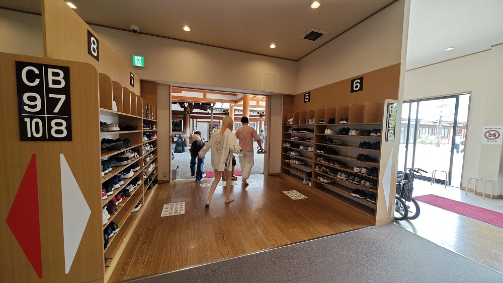 进入主殿前,要先到鞋帽间,脱下鞋子,放在鞋子存放格内。