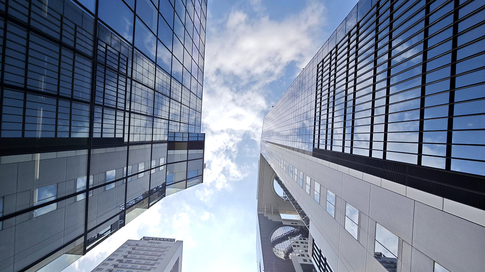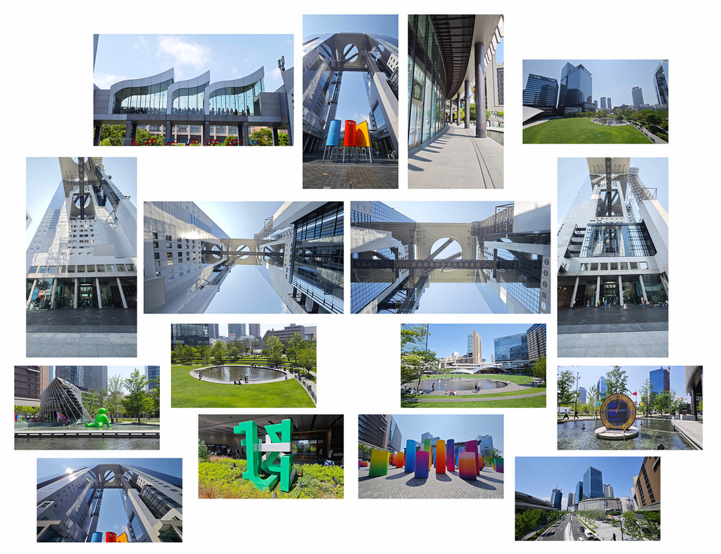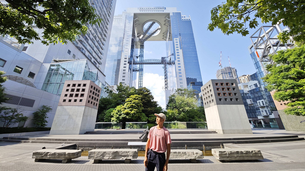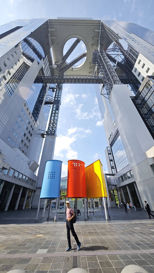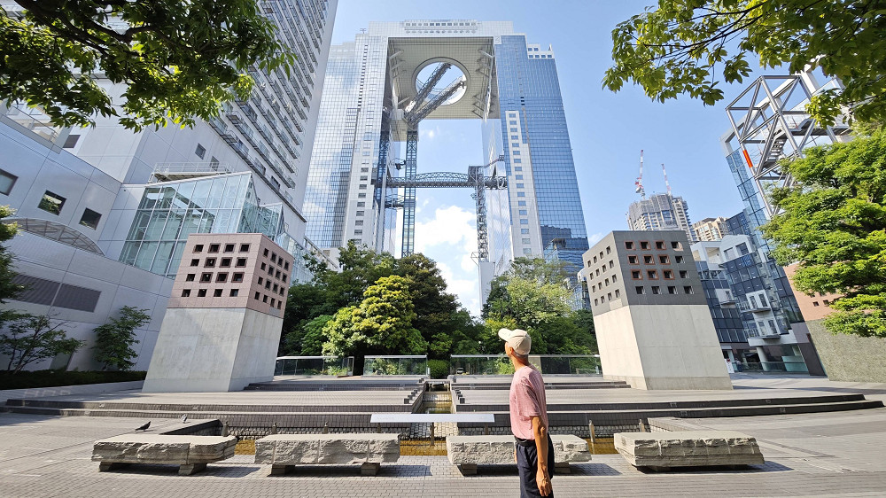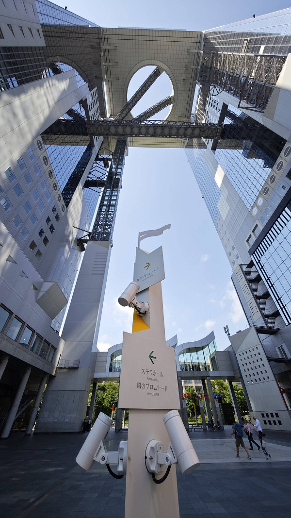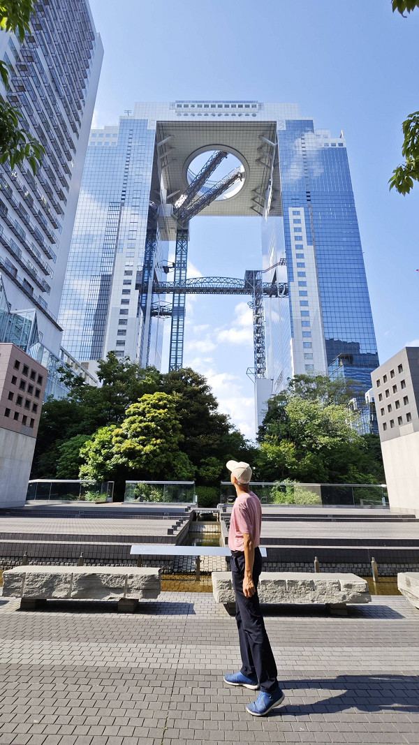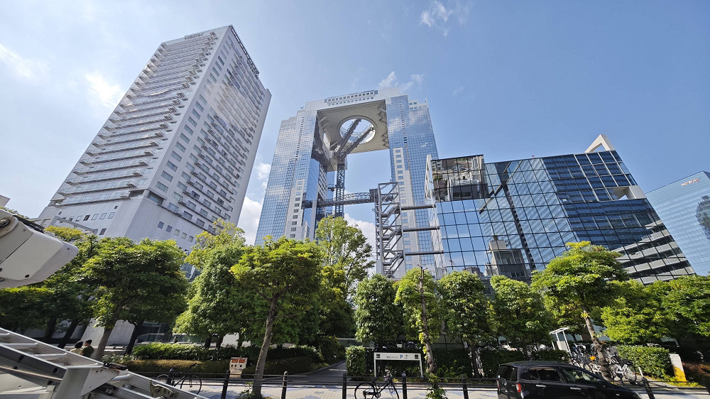 梅田蓝天大楼是在日本经济繁荣时期即将结束之际建成,最初的构想是想要将此综合设施建造成四栋顶楼相连的大楼。蓝天大楼是由知名建筑师原广司设计,其中两栋大楼在1993年完工;两栋大楼以空中庭园相连,成为此综合设施吸引游客参观的主要特色。其地下楼层是以日本昭和时期(20 世纪初期)为蓝本的购物中心。