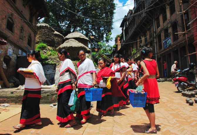 在巴德岗旅行期间,刚好遇上了这里的女人节。“女人节”是尼泊尔的传统节日,节日期间会举行欢乐并且丰富多彩的宗教庆祝活动。这一节日是为纪念印度教主神之一湿婆及他的妻子帕尔瓦蒂。在“女人节”期间,尼泊尔境内的印度教妇女都要进行斋戒,并为家人祈福。此外,已婚妇女多祈祷婚姻的幸福长久,家人平安,未婚女子则祈求神赐予自己一个好丈夫。