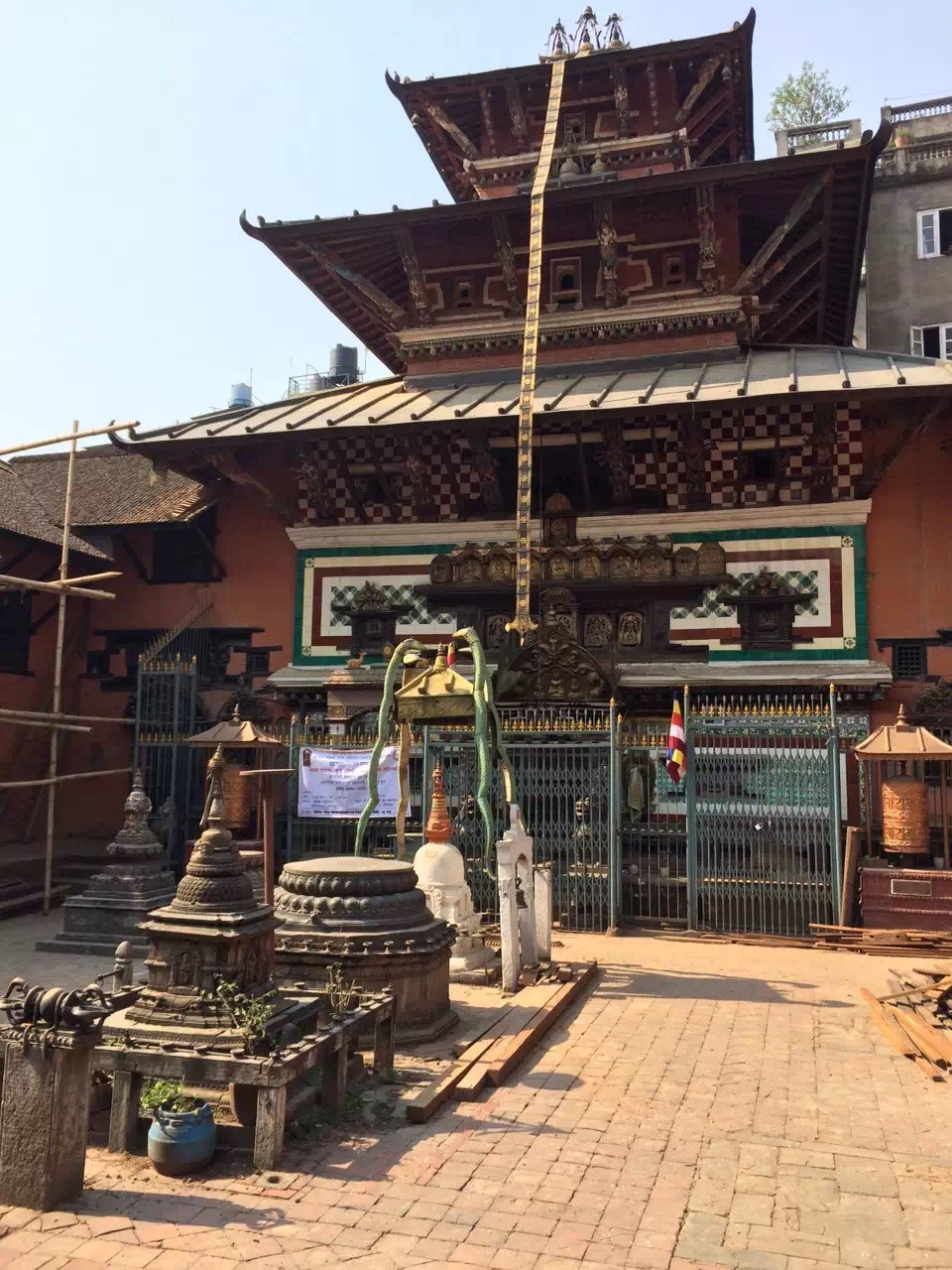 加德满都的金庙GoldenTemple—不仅是铜像,就连主殿,宝顶、屋檐、殿门全都是用纯铜铸造,比金子少了几分的耀眼,但却多了些许的古朴庄重,在地震中活下来的金庙,只有少部分屋顶受到了损毁。