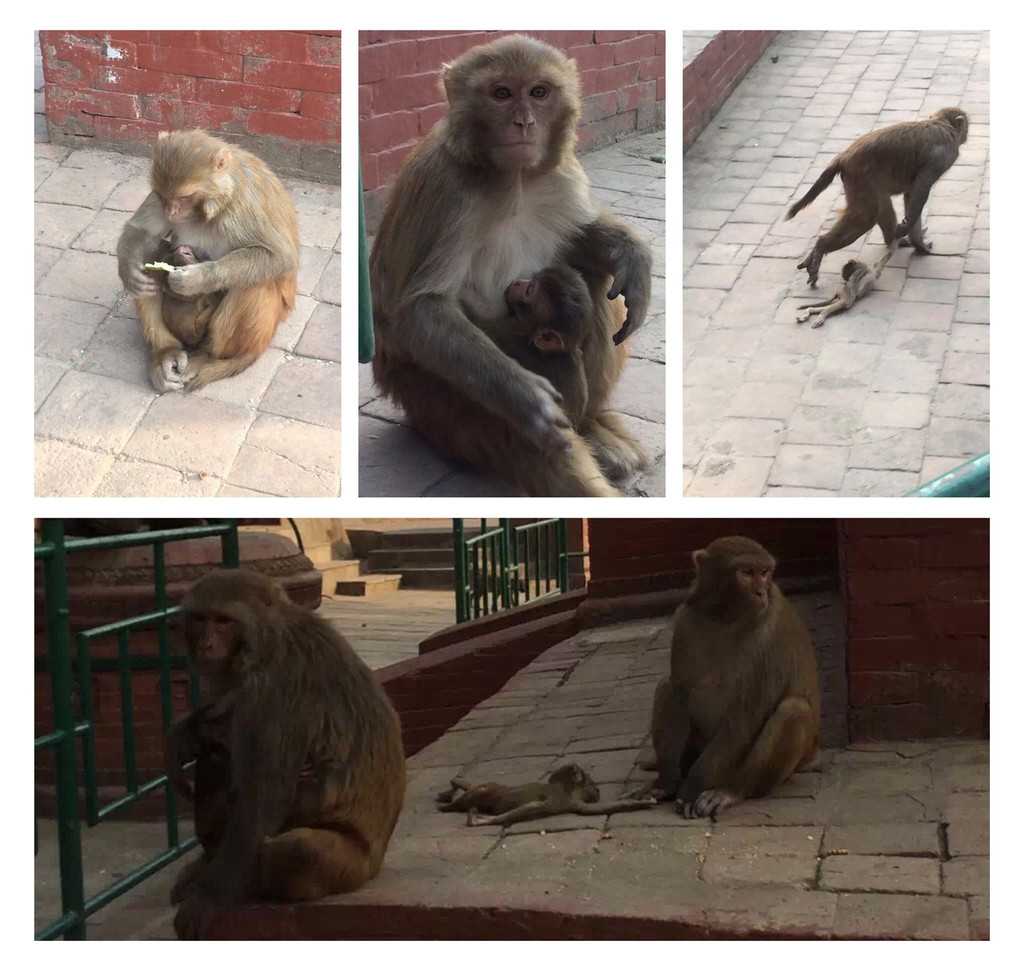 据说文殊菩萨在此剃去三千烦恼丝,头发变为树木,头上的虱子则化作猴子。因此这里的猴子被视为“圣猴”,受到寺庙僧人和居民的尊敬和保护。这些猴子在这里“修行”,万物皆有灵——舔犊之情,活着,死亡都不离不弃,只能用镜头记录这无法言语的画面。