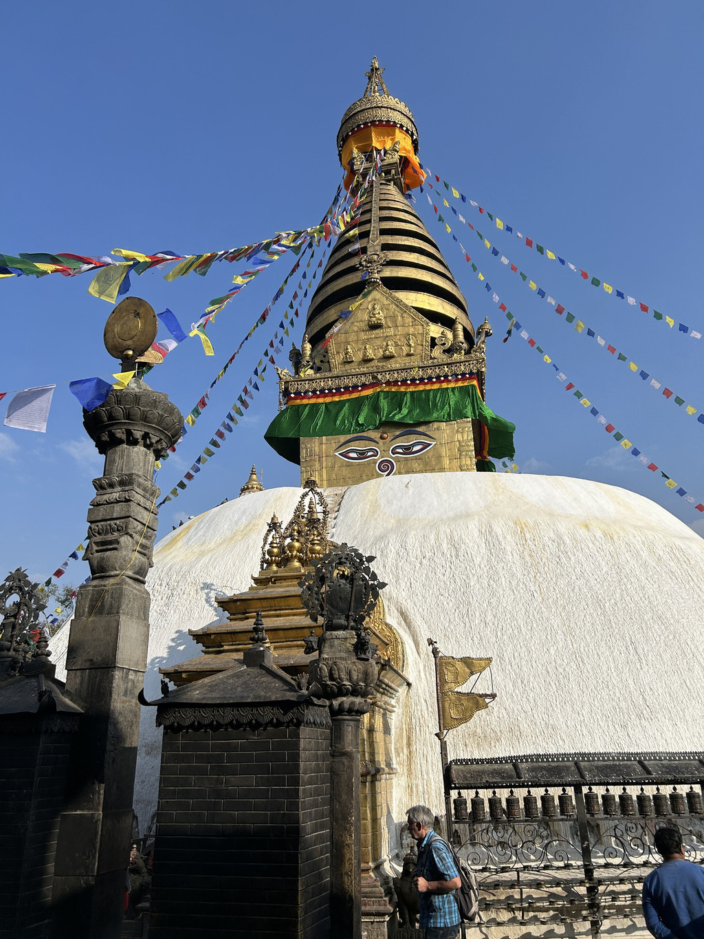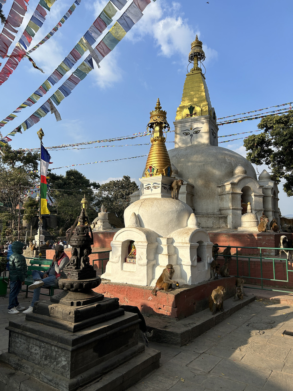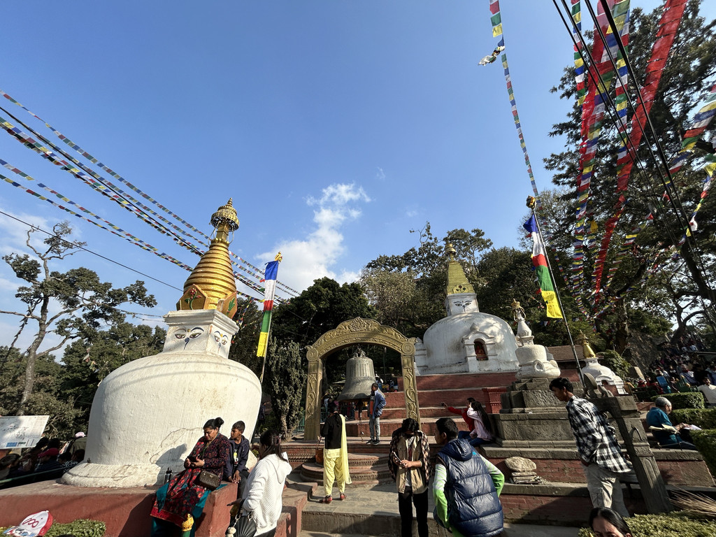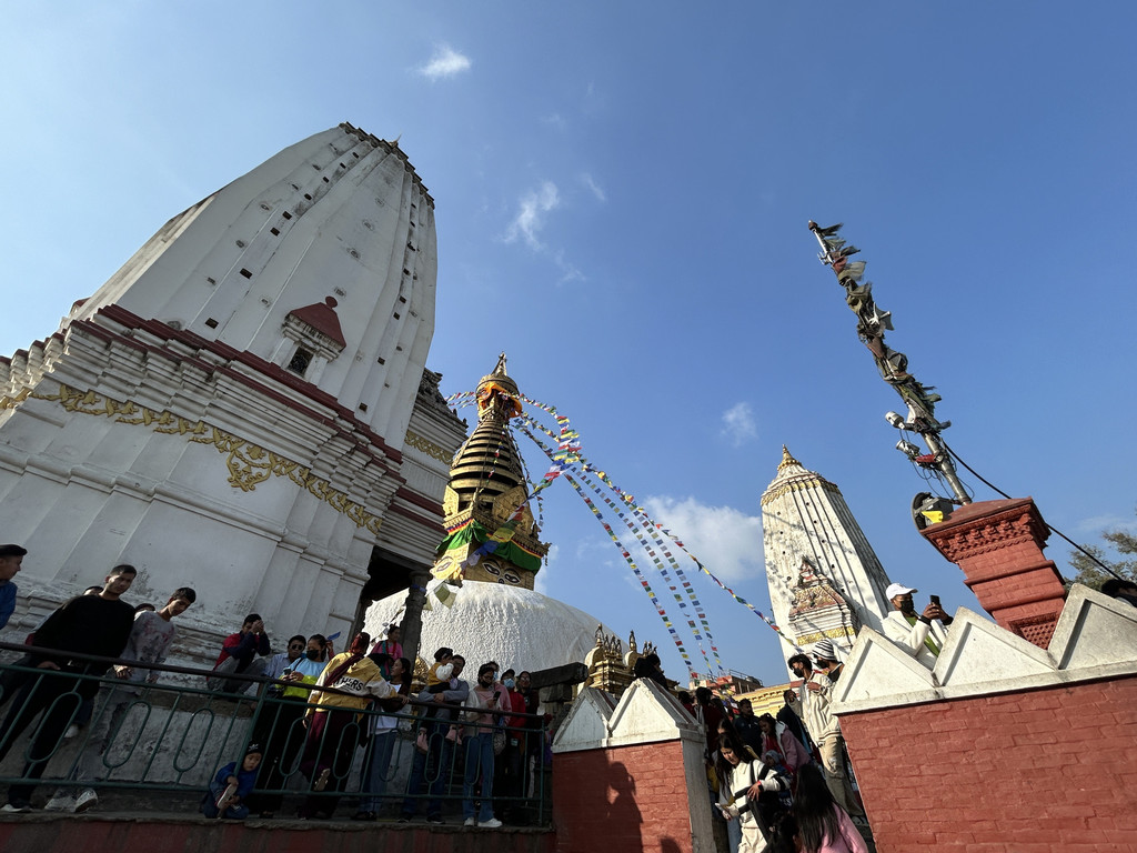接着继续的行程是斯瓦扬布纳特寺(Swayambhunath),斯瓦扬布意为“自体放光”的意思,也是一座圆佛塔,位于加德满都西南郊外斯瓦扬布山顶上,因那里野生猴子很多,便被人们称之为“猴庙”。它建于公元前3世纪,是亚洲最古老的佛教圣迹之一,是世界文化遗产之一,也是尼泊尔开展国际佛教交流的中心。