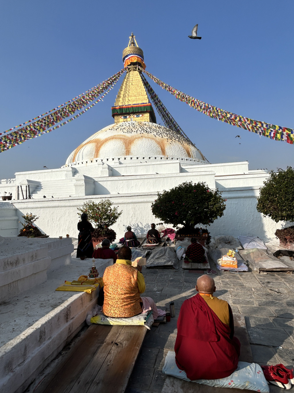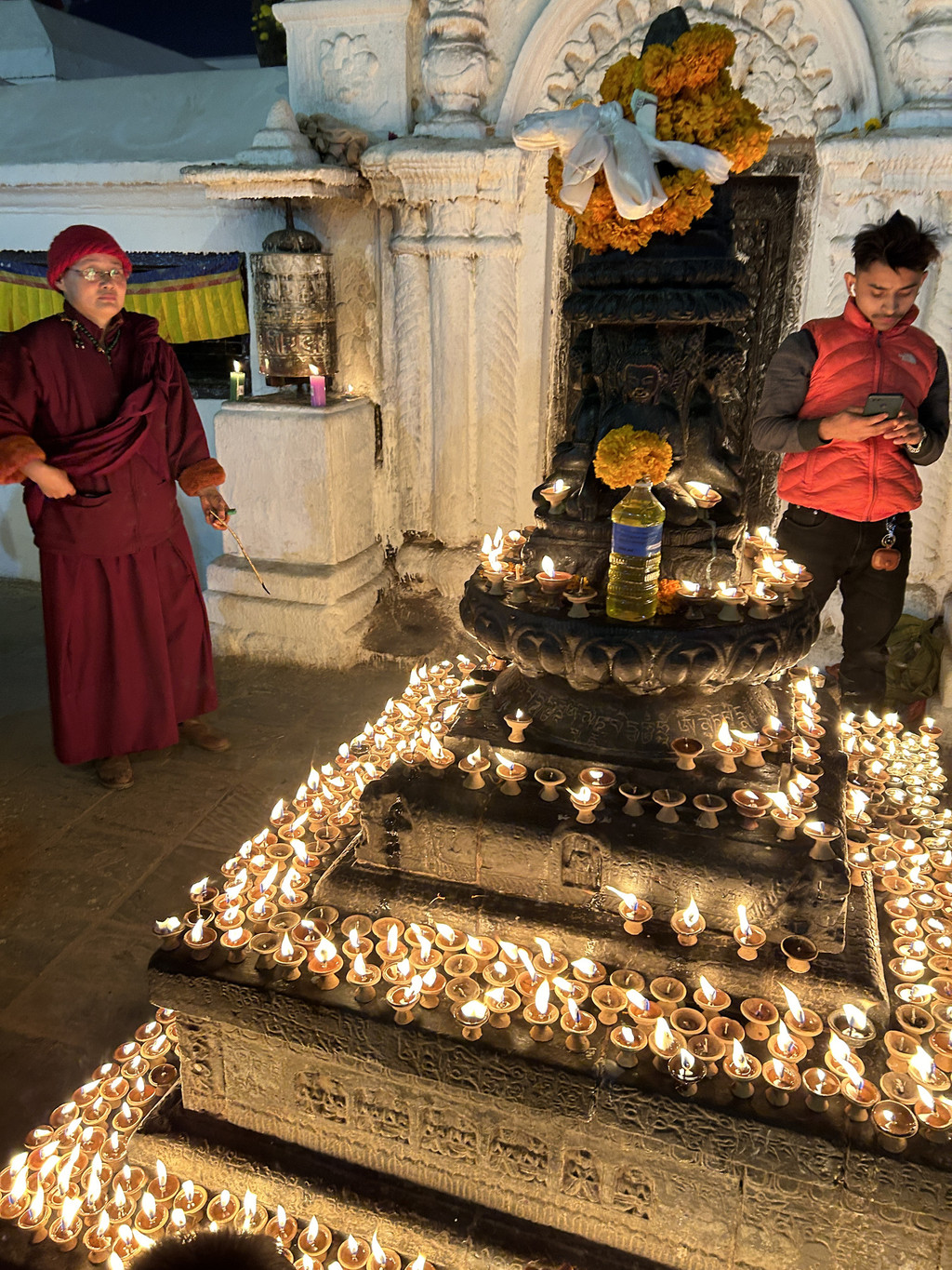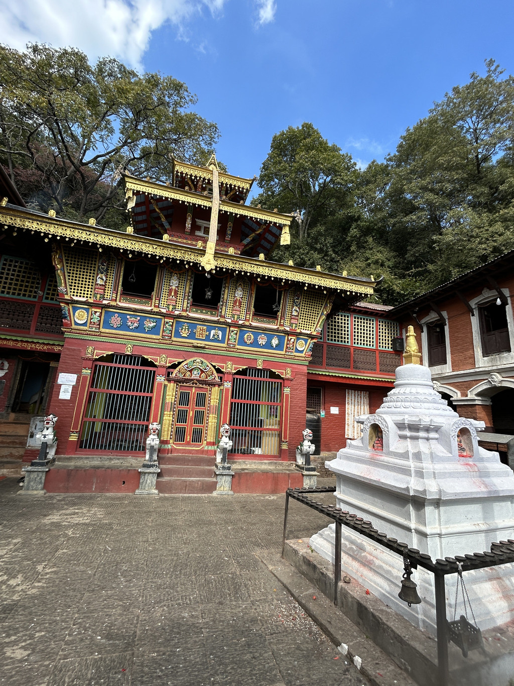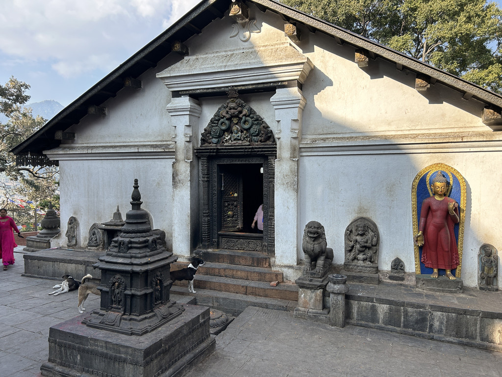 接着继续的行程是斯瓦扬布纳特寺(Swayambhunath),斯瓦扬布意为“自体放光”的意思,也是一座圆佛塔,位于加德满都西南郊外斯瓦扬布山顶上,因那里野生猴子很多,便被人们称之为“猴庙”。它建于公元前3世纪,是亚洲最古老的佛教圣迹之一,是世界文化遗产之一,也是尼泊尔开展国际佛教交流的中心。