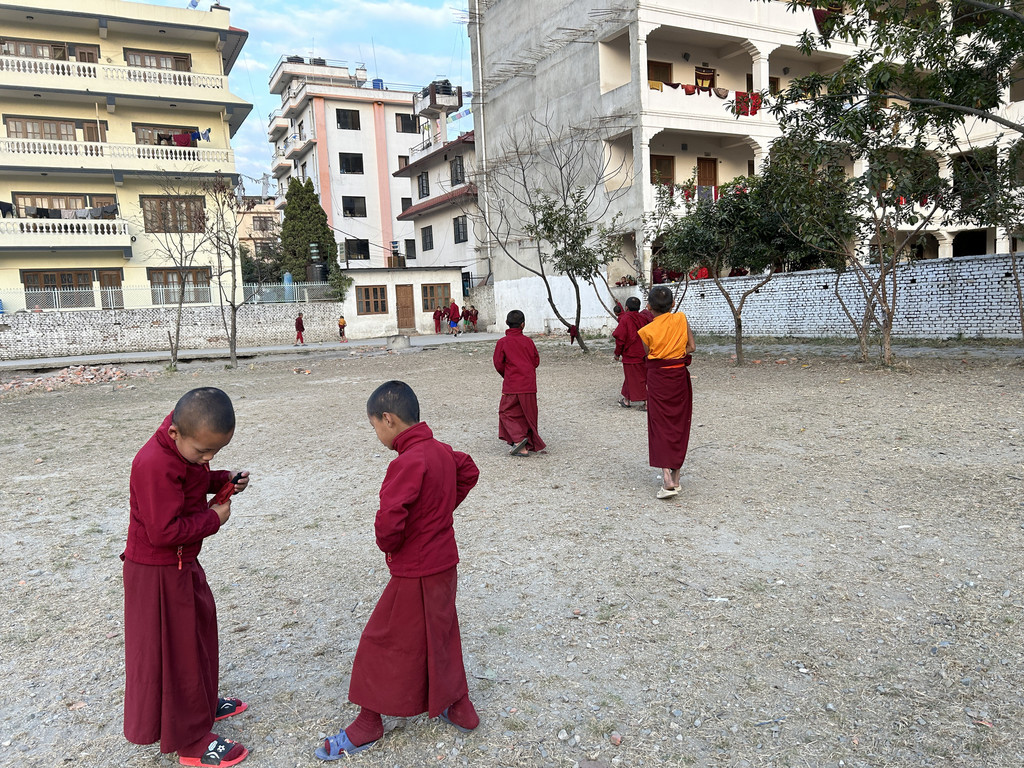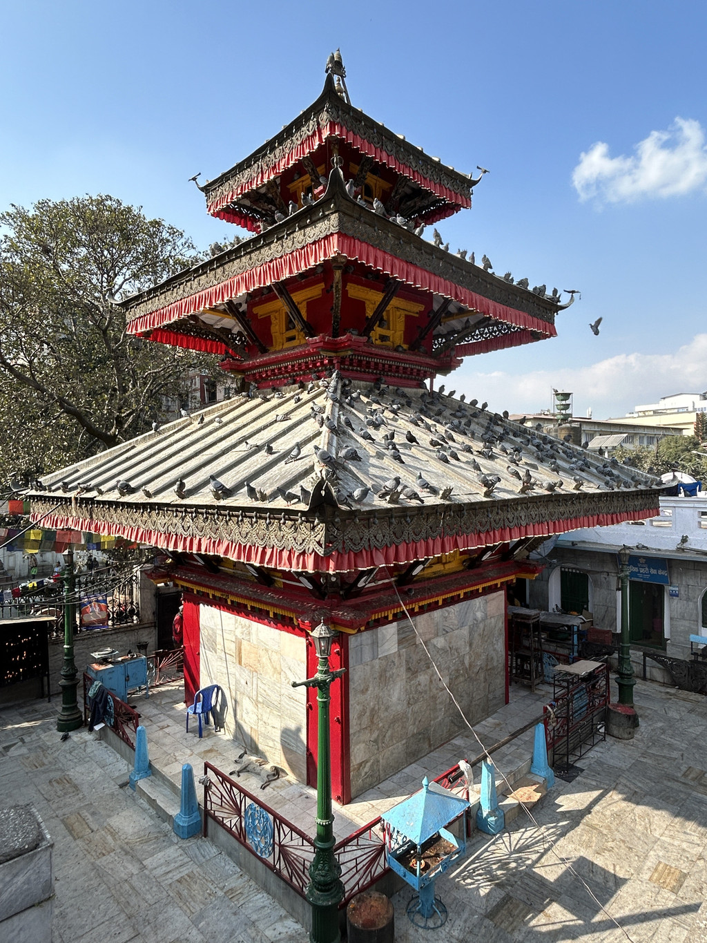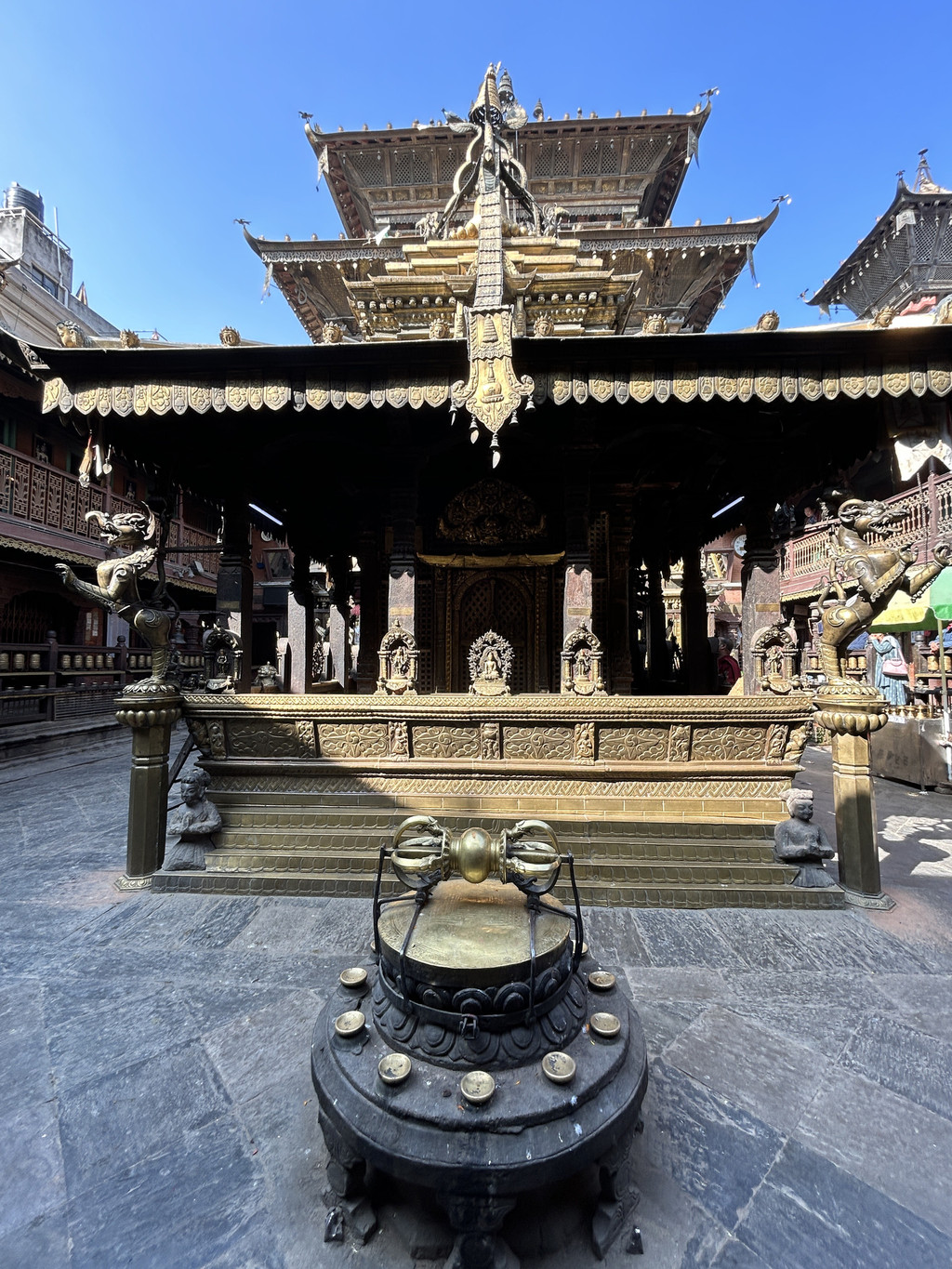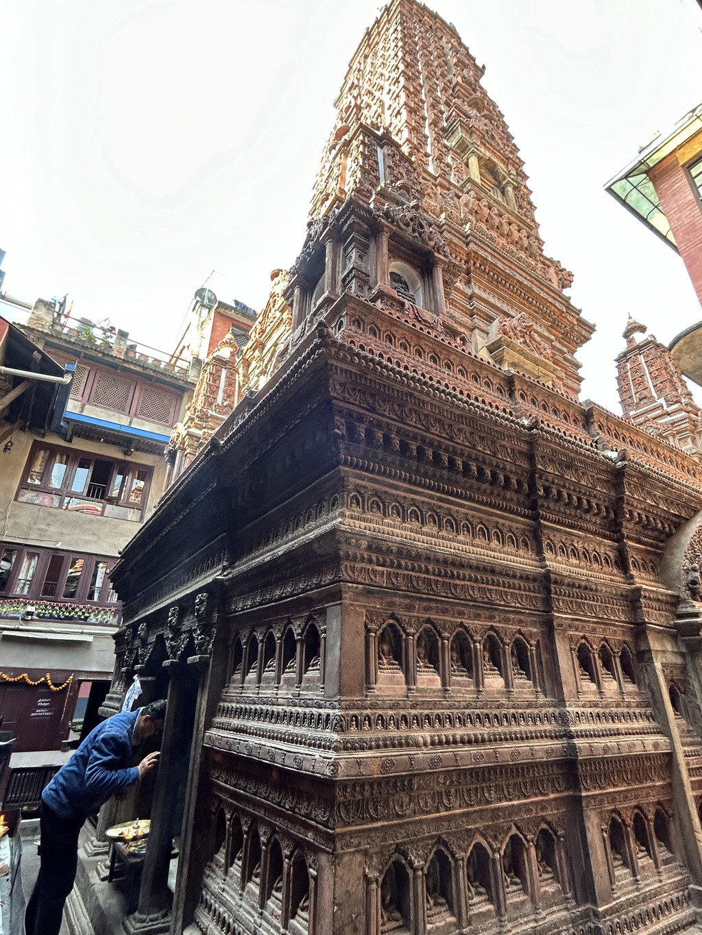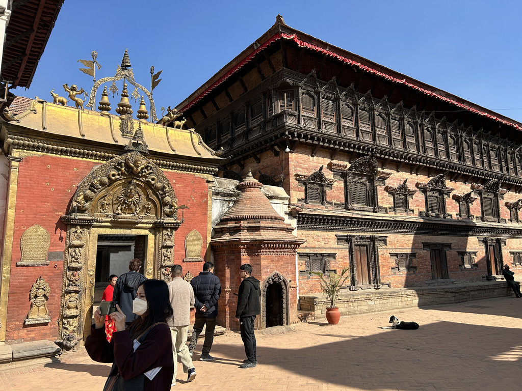 我们从乘坐出租车大约40分钟后,先步行前往千佛塔、金庙,不知不觉中已经进入广场区域。我们边逛边拍,在冬日的暖阳下走走停停,正要走出广场时,背后一位保安模样的当地人与我们交谈,因语言沟通障碍,双方都不知所云,猜测他看我们是背包游客模样, 是来检查门票事宜的,但我们已参观完毕,乘车回到加德满都。