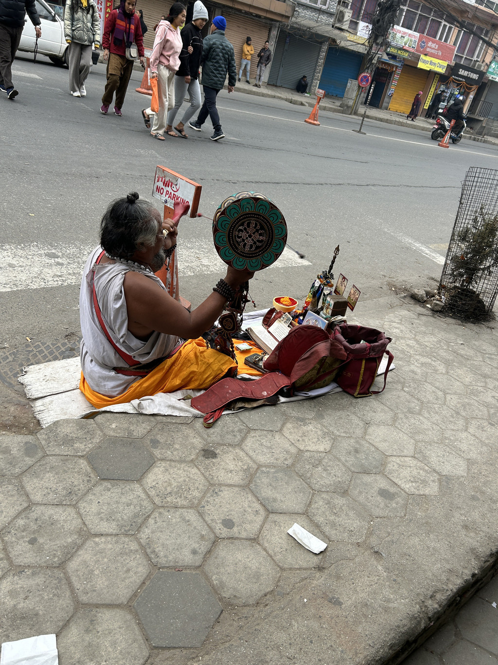 回到加德满都我们入住位于泰美尔区的酒店。泰美尔是加德满都最繁华的商业区,有点类似一个中国式巨大的城中村,没有高楼大厦,基本上都是五六层的私人建筑,街道宽处不过五六米,窄处两三米,即使这样的道路,跑出租的奥拓车依然川流不息,行人、三轮车、汽车拥而不堵。我们入住酒店放下行李,来到街上逛荡,整条购物街就是一个超级大的旅游商品市场,店铺林立,就连偏巷里也摆摊设点,随处可见川菜、重庆火锅、兰州拉面带中文标志的店铺、旅馆,不时入耳的普通话也向我们推荐住宿、推销商品。
