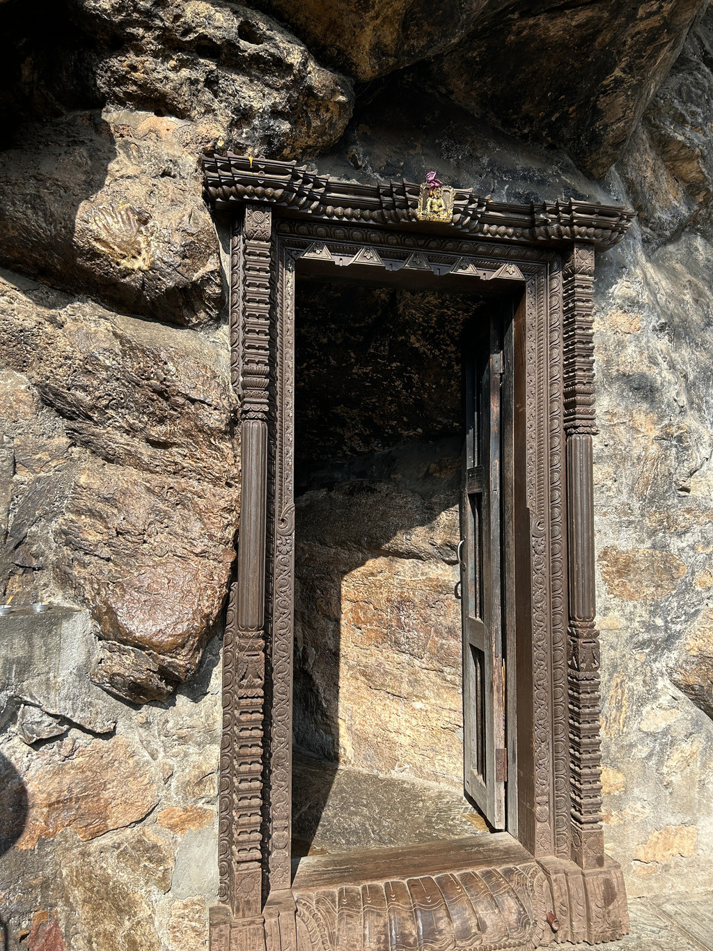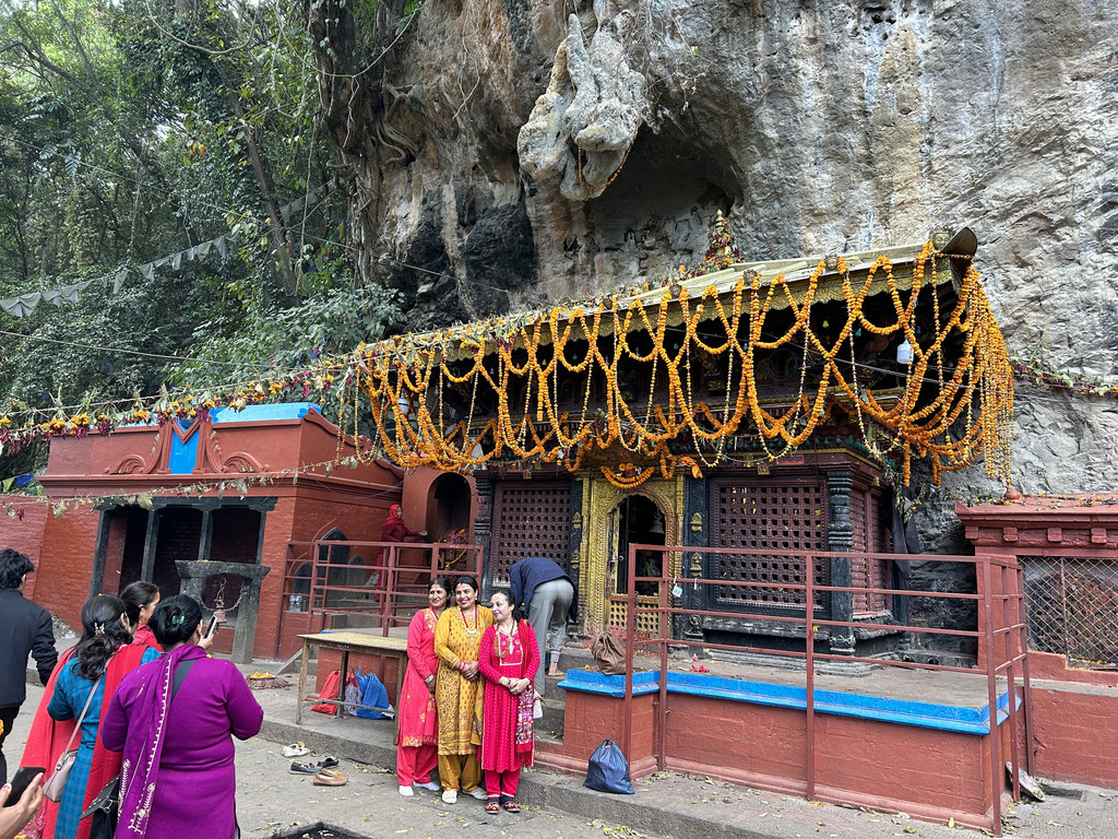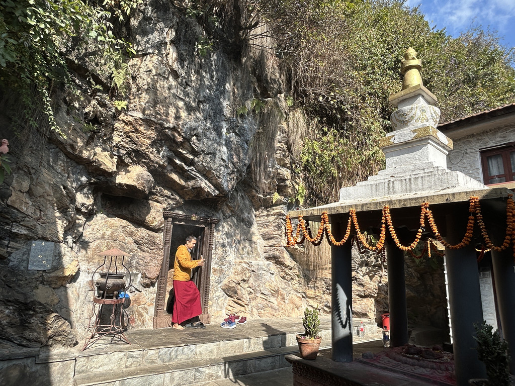 首站行程是帕平(Pharping),从酒店到帕平相距20多千米,乘坐出租车历时80~90分钟。帕平是莲花生大师修持普巴金刚成就的圣地,以莲花生大师圣迹而著名,大师在此修行时所留下的珍贵手印、脚印,为后世参访者增添了无尽的信心以及修行的愿力。在《莲花生大士全传》中记载: “莲师在瓦斯达拉等地,为尼泊尔的众生加持修法,以成就殊胜的佛法事业,并将宝藏埋藏在阿苏拉扬烈修。尼泊尔帕帕香贡等佛殿与十分险峻的地方,埋下了一千多处的伏藏”。
