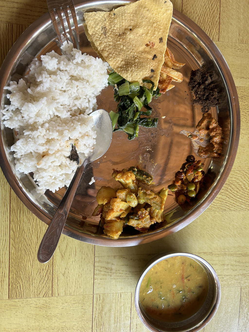 2.货币及物价:尼泊尔卢比是尼泊尔的货币单位,我们在机场换算时的汇率是1元人民币=17.84元尼泊尔卢比,此后我们都在一些中国同胞开的餐饮店或纪念品商店换取,大约在18.5~18.8之间。尼泊尔的物价与我们生活的厦门相比是非常便宜的,在尼泊尔的8天的总支出是每人8000元人民币左右,机票、酒店是在携程网上预订的(在玛拉蒂卡的两晚是现场住店付款的),乘坐出租车必须与司机讨价还价,一般是在司机开的价格上先拦腰一刀再加价少些,与我国上世纪八、九十年代在街边购物的情景类似。早餐已经包含酒店住宿费中,正餐每人每餐不超过1000卢比(我俩都是俭朴的穷人),在山区的物价更便宜,在玛拉蒂卡的午餐是正宗的尼泊尔山区农家素菜,每人300卢比,一碗酸奶50卢比,一串香蕉100卢比,一堆橙子(7个、每个80mm左右)100卢比,付款时简直不敢相信这是真的。