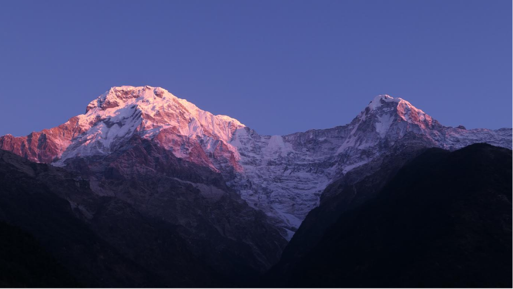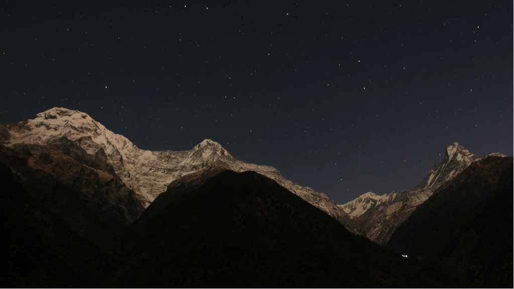 完全黑暗的夜空中闪烁着星光,近处的山全部是黑色的轮廓,只有远处的安娜普尔纳雪山闪烁着耀眼的白光。此刻的我只感觉浑身起了一层鸡皮疙瘩,瞬间困意全无。我们在惊喜之余,开心对我们说这还没结束,一会还会有更多的惊喜。日出日落的圣杯时刻是极难用镜头捕捉的,当我盯着山峰看时,巨物带来的压迫感仿佛它在向我扑面而来。不一会,山顶由白色变成了一阵浅浅的金色,紧接着又暗了下去。天色慢慢亮起来,还没有看到太阳的时候,此时此刻整个山谷里透出一阵浅粉色,山谷里也活跃起来,几声鸟叫打破了清晨的寂静。真正的 日照 金山是发生在这时候,当第一缕阳光径直地照射在山尖上安娜普尔纳Ⅰ峰,仿佛为它加冕了一顶王冠,渐渐地大半个雪山全部闪耀着金色的光辉。这座全球第十高的雪山似乎并不吝啬展示它的形象,能够见证它的日出,也是我们的荣幸。