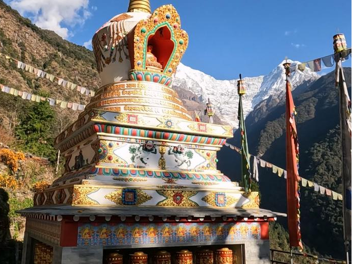 尽管旅程即将收尾,但我这次的心理却没有一丝不舍。因为我觉得把握住了ABC想展现给我的每一面,我也带着丰富的记忆和素材满载而归。今天是个晴好的天气,回到chhomrong又看到了来时的佛塔,我顺时针围着它朝拜了一圈,谢谢它的庇佑能让我们的行程如此完美。这次的旅程一直在变换着我对雪山的感情,从神往到遥望,从了解到告别,安娜普尔纳似乎从没拒绝也从未挽留。在社会中我们学会的,是不给随机发生的事件赋予意义,但来到这里似乎是一件命中注定的事,注定我要成为这里的过客。