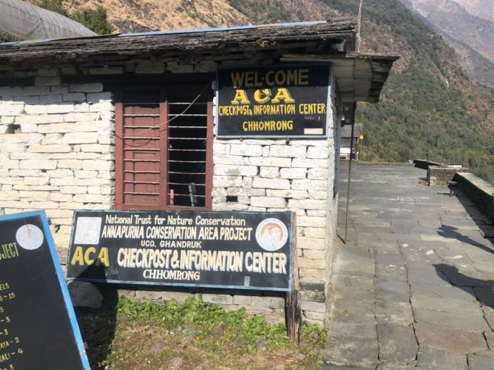 吃过早饭后,我们启程出发。穿过清晨的chhomrong,才发现这里是一个很大的村落,除了各具特色的民宿,还有进山证的检查点,ACAP进山许可证每个徒步者都需要提前办理进山证件(3000尼币),在 加德满都 可以办理,我们的向导为我们提前办理好了,我们直接通过。村子里还有几座佛塔,从塔顶悬下的几道经幡随风飘扬,远景有雪山的映衬,仿佛雪山和佛塔是一对挚友,永远默契的陪伴着彼此。