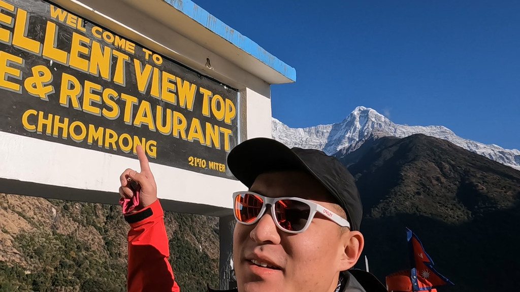 紧接着上路,在下午3点就到了chhomrong,大家都觉得还能再走一走,但向导开心却说在这里下榻是一个很成熟的选择。为什么这么说呢?因为每一个村落所能观赏到的景观是不同的,chhomrong所在的位置视野开阔,是观赏安娜普尔纳Ⅰ峰 日照 金山的最佳角度,在这里停留一夜,会得到意想不到的收获。走进这家名叫excellent view top的二层民宿,我们找到了自己的房间,房间的条件并不算好,提供两张床,一个洗手间,仅此而已。