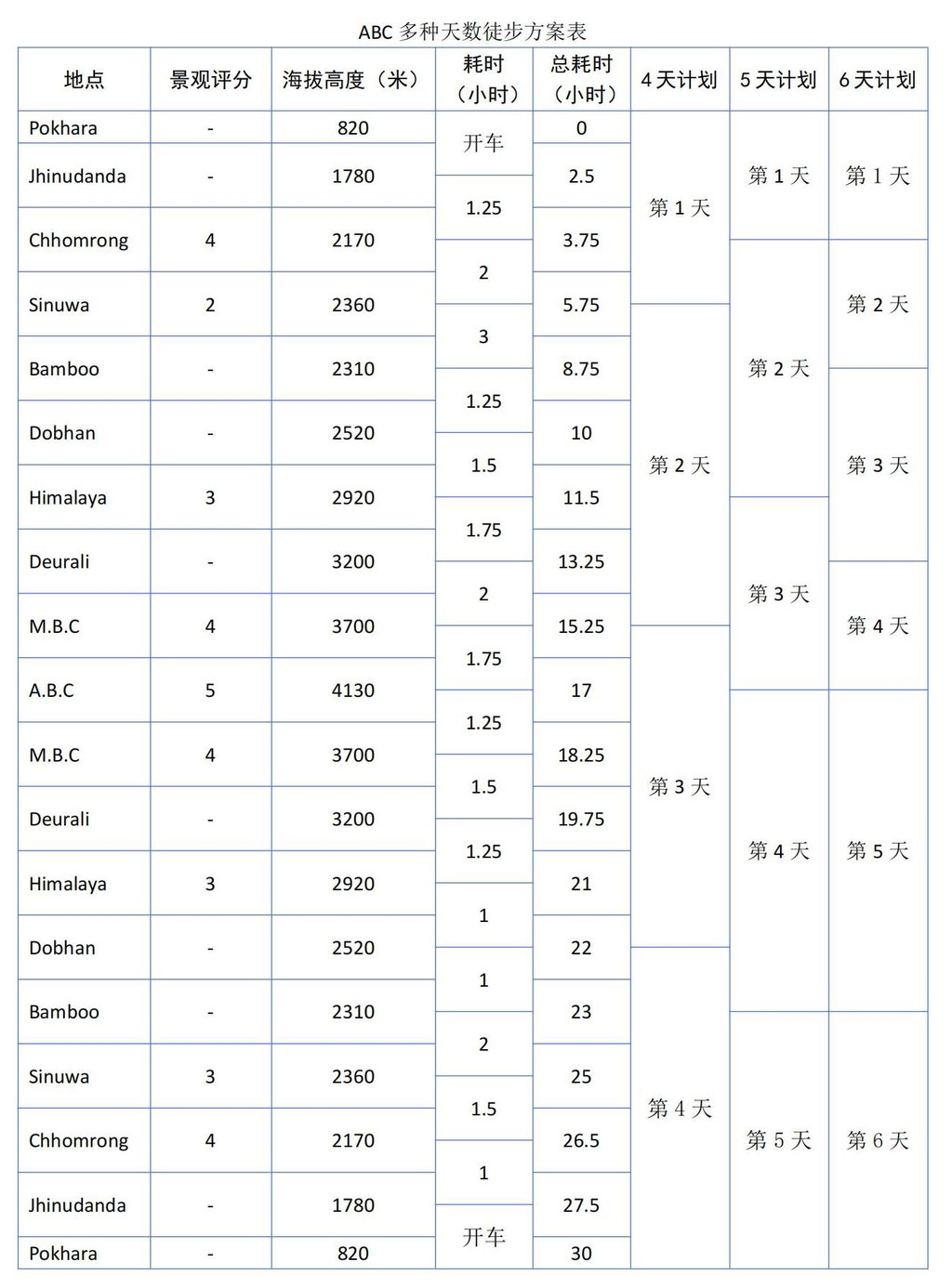 由于尼泊尔的户外产业比较发达,也催生出了向导、背夫等职业,因此徒步者完全可以轻装上阵,享受沿途的美景。该条路线中将串联多个村落,每个村落中都有若干民宿,都会提供美食、住所、水电气热等服务。与此同时,由于每个人的配速、计划不同,对于天数的把控也是丰俭由人,选择空间非常大。我综合每日行程的强度和各个村落的景观,归纳出一份多种天数的建议方案,供大家参考。