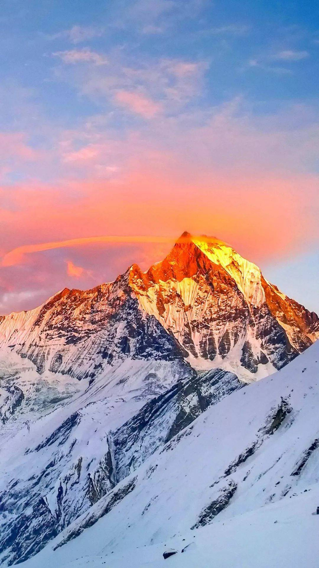 在布恩山看日出,完美的道拉吉里群峰(海拔8167m)和安娜普纳I号峰(海拔8091m),安娜普纳南峰(海拔7219m),因出里峰(海拔6441m)以及鱼尾峰(Machhapuchhre,海拔6997m)在晨曦的照射下散发着圣洁的光芒。