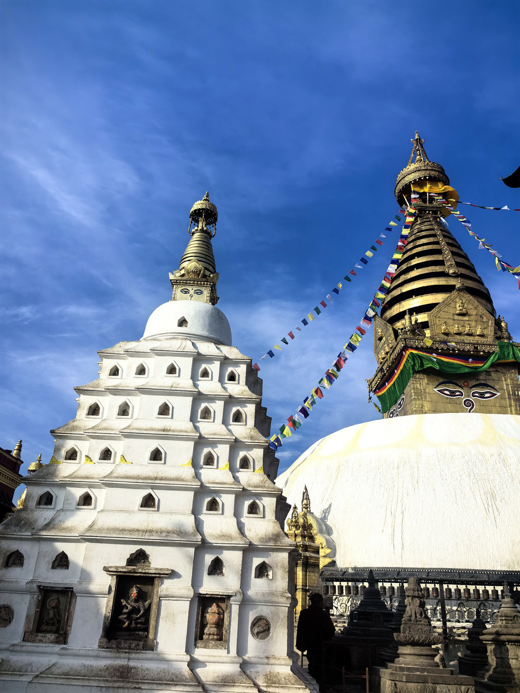 下午是游览斯瓦扬布纳特寺,也就是猴庙,建于公元前3世纪,是 亚洲 最古老的佛教圣迹之一。斯瓦扬布纳特寺的主体建筑佛塔造型奇特,具纯白色的塔基,金黄色的塔身,高耸的华盖与宝顶,在阳光照耀下交相生辉。主体塔高四五十米,下部宏大庄重的塔基为一巨大的粉刷白色半球实体,是佛教丰富的象征,代表创造生命的子宫。塔基四面都有三重檐的 金门 金顶佛龛,内供着五方如来。第二层是一截镀金的方型砌石建筑,四面各绘着一双巨眼,称慧眼,象征佛陀无上智慧,无所不见;每对慧眼之下还有一个红色问号形的 尼泊尔 数字“1”,代表佛的鼻子,据说在佛教中它意味“只有止恶行善,方能离苦得乐。”,象征大千世界的和谐统一。第三层是层层递减的13个铜制镀金圆盘,叠成圆锥形,象征 菩萨 从因至果的十三行位,四面饰以佛像和图案。第四层是象征日、月二光的两层圆轮。第五层塔顶承托着一个结构繁复的巨型华盖,用厚木做底,上覆盖铜质板瓦,板瓦之间又用铜脊瓦接缝,四周悬绕数十挂铜质透雕华幔,每挂下又悬着一口小铜钟,清风吹来发出阵阵清脆悦耳的声音,象征涅槃胜果。华盖顶上又竖起高达数米的铜质镏金宝顶,称为塔刹,顶端东部是一个硕大的青铜金刚杵(雷电),是密宗权力的符号,饰以藏族生肖的图案,犹如王冠上镶嵌的金顶一般闪闪发光。这种在 尼泊尔 叫做“柴特亚”式的佛塔,被誉为 尼泊尔 佛教金塔建筑的杰出典范。
