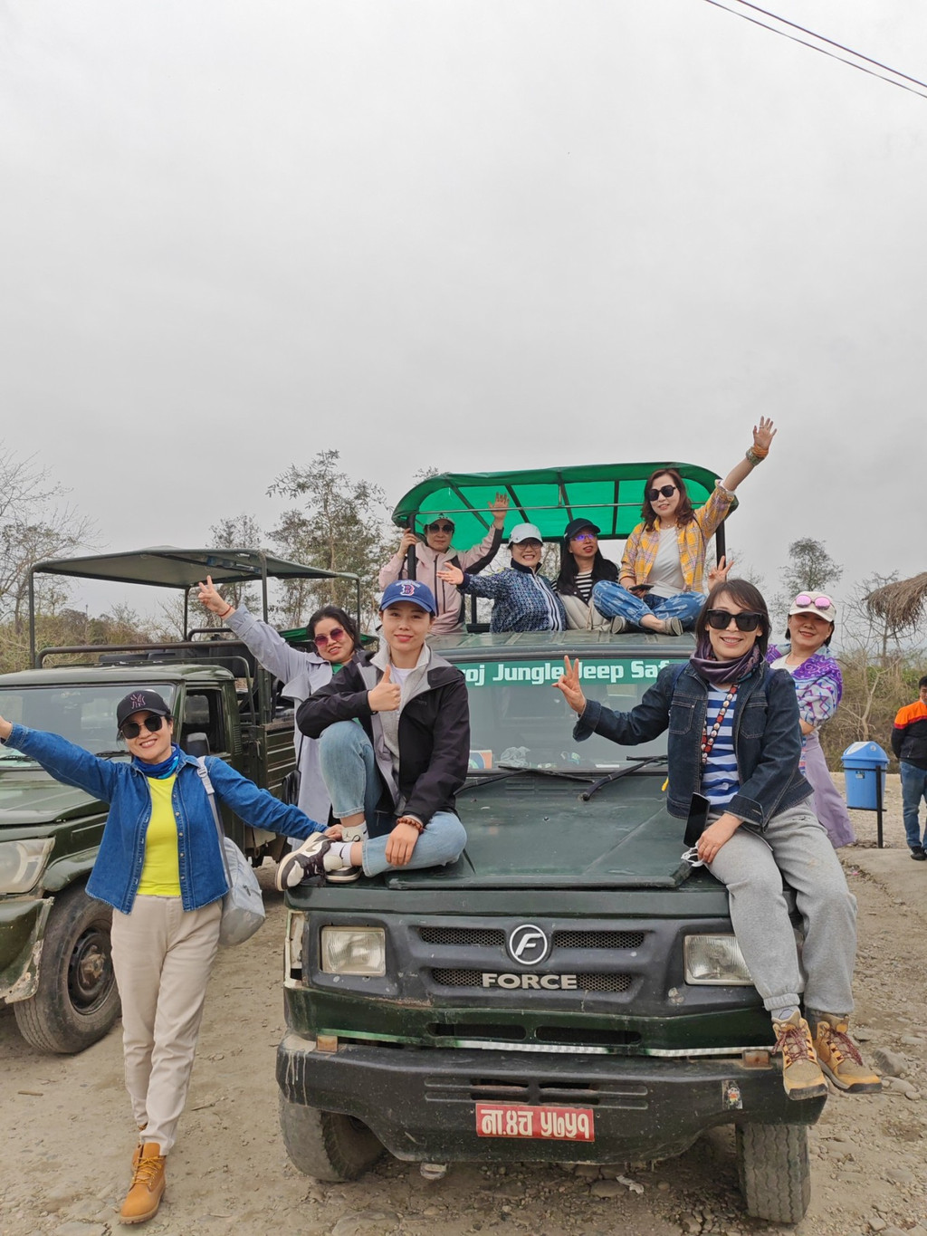午饭后我们参加了吉普车的自费活动,出发去吉普车活动之前还发生了一个小插曲,真的让我们特别难忘。因为这次孟孟组的团,有8个单女是她的客人,团上还有8个散客是别的地方的。在奇特旺吉普车活动是9人一个吉普车,然后就发生了我们9个人想坐一起的情况,但是有两个散客的客人先上车了,不肯去另外一个吉普车,最后没办法就我们11人一个车外加一个导游,很幸运导游是会中文的。另外一个车只会英语,导致那边的散客全程都没听懂,我们车气氛就完全不一样了,真的一路欢声笑语,随时停车随时拍,导游一直在跟我们聊天介绍,到中间休息的时候,一开始上来的两个散客受不了了,直接走了。于是从今天开始,我们9人正式成为一个TEAM,后面再也没分开过,走哪都一起,超级一致。