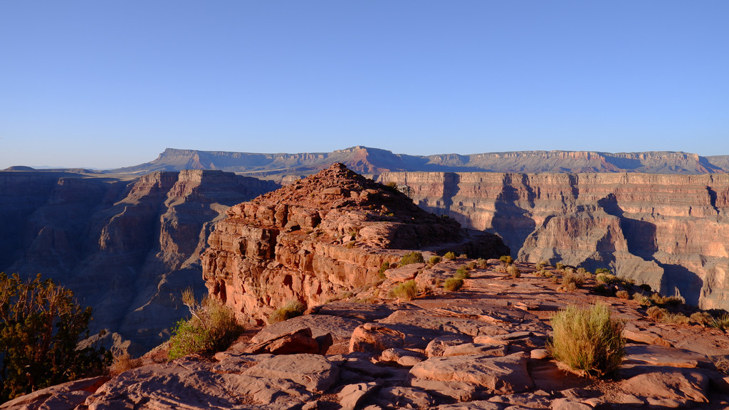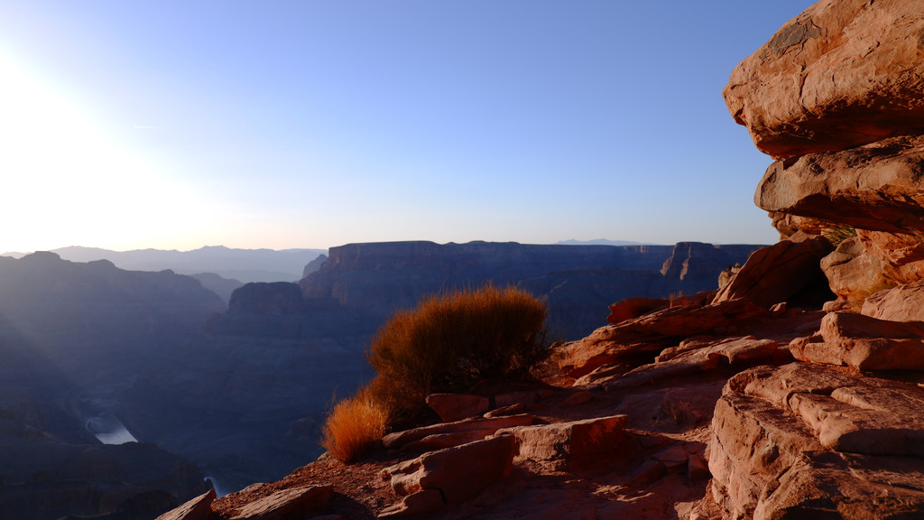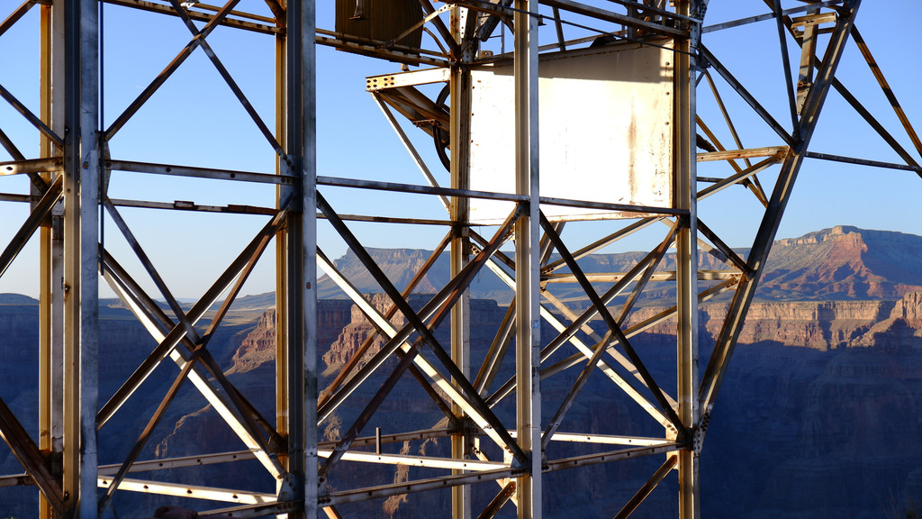 第三个巴士停靠点是Guano Point。爬到岩石顶端,向四周眺望,对着夕阳,拍出来的剪影效果还是蛮不错的。悬崖边还有一些从20世纪30年代遗留下来的采矿设备的遗迹。锈迹斑斑的钢铁结构加上以壮丽的大峡谷为背景,取景效果也是一绝。