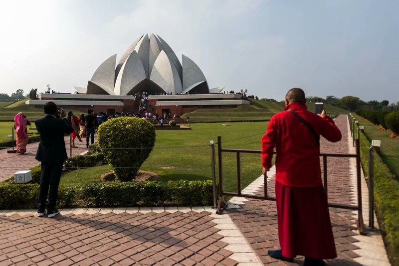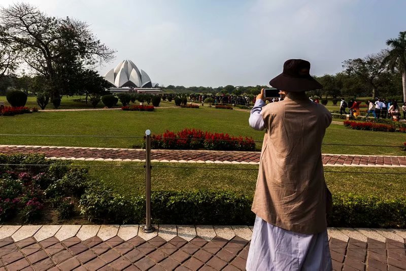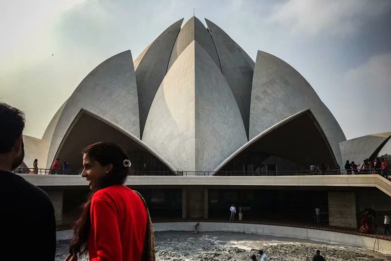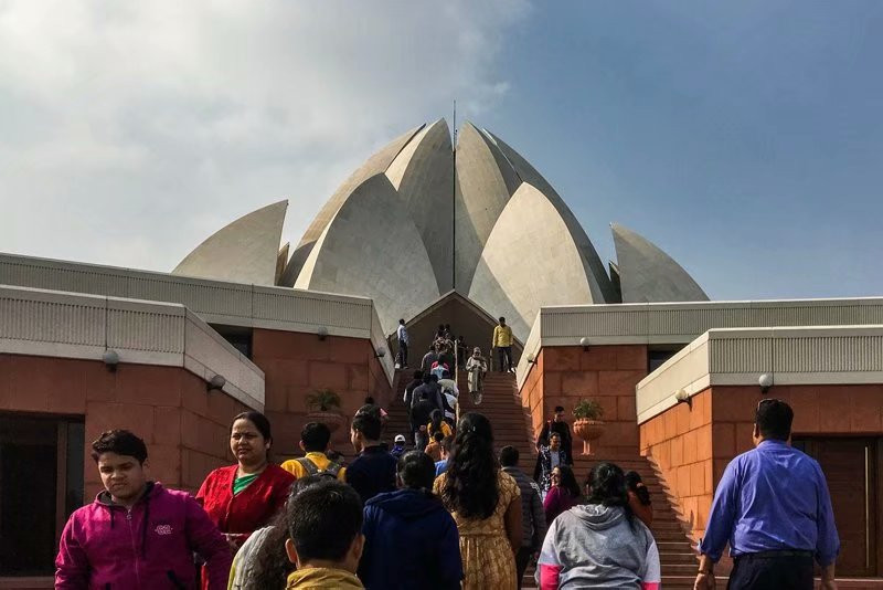1986年建成的莲花庙,是巴哈伊教(大同教)的礼拜堂。各种族、各宗教的人都可以在此祈祷,但必须排队、脱鞋、分批次进殿,不能照相、不能高声喧哗。我在里面静静地坐下,听信徒悠扬地诵读着巴哈欧拉的作品。回想起四年前在以色列海法,地中海边巴哈伊空中花园那扇冰冷的大铁门,因为不是教徒,所以只能站在山顶,俯视那条悬挂于空中如同波斯长毯的巴哈伊花园,什么“世界大同,人类一家”,不过是一个理想,在那里不是一家人,真不能进同一个门。但在印度这个理想实现了,想来好简单,就是一个包容,来者请进,你我都是一家人。