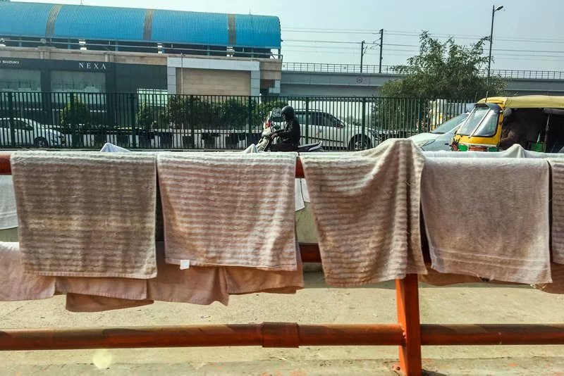 高架桥的栏杆上晒满了床单、被套和枕巾,这些都是小酒店所为吧?
