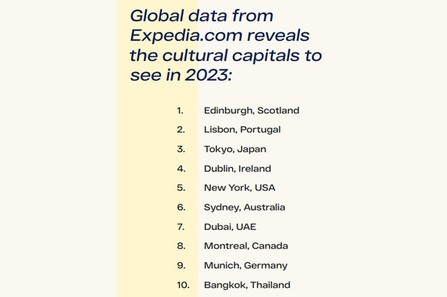 日前,全球最大的在线旅游公司Expedia通过对游客数据库的深入研究及详细调查,公布了2023年全球十大文化之都榜单。