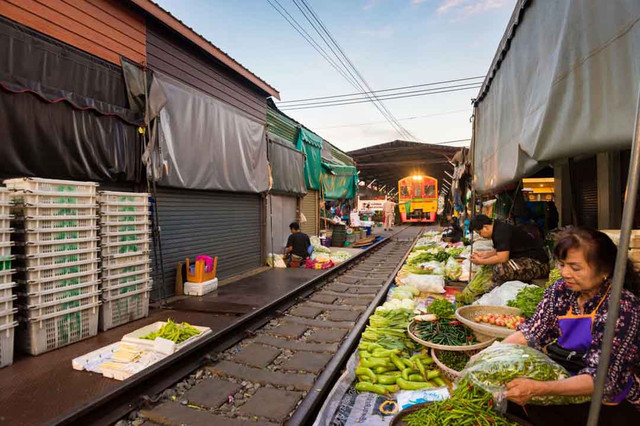 至于与火车“抢地盘”的网红铁道市场,你一定有所耳闻。建在美功铁路轨道上,美功铁道市场(Maeklong Railway Market)是曼谷最著名的传统市场之一,这里不仅有新鲜农产品和地道美食,还可以看到摊贩们为了给火车让道快速收摊出摊的奇特风景线。