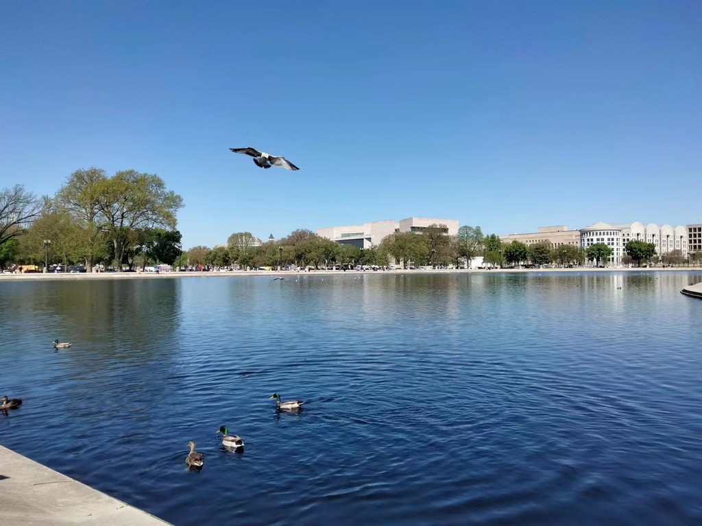 第四天早餐过后,6人开两辆SUV车加满油出发前往华盛顿特区,大约1小时的车程抵达DC中央火车站的停车场,步行穿过火车站,从站厅走出来赫然发现以前经常在电视里看到的美国国会山大厦屹然就近在眼前啦哈哈!这一天仍然是阳光灿烂,早晨人不多走在国家公园非常惬意,路上不时会看到小松鼠在草地上或在树上玩耍,我们的游览路线大致是国会山国会大厦-->方尖纪念碑-->白宫-->韩战、越战纪念碑-->林肯纪念堂-->樱花园。除了白宫是戒备森严不能靠近,其他地方都可以自由参观,白宫比想象的低很多大门前有很多人拍照。中午大家在华盛顿法学院附近的商业里吃了午餐,Ee How特意请我喝一杯SAPPORO(日式札幌精酿啤酒),我们第一次举杯为中新友谊干杯!途中还路过了IMF办公楼也就是国际货币基金组织。DC National Park面积很大,我们整个区域走下来大概6个多小时,那天我的微信步数记录是21k多步位列第一,哇哈哈!