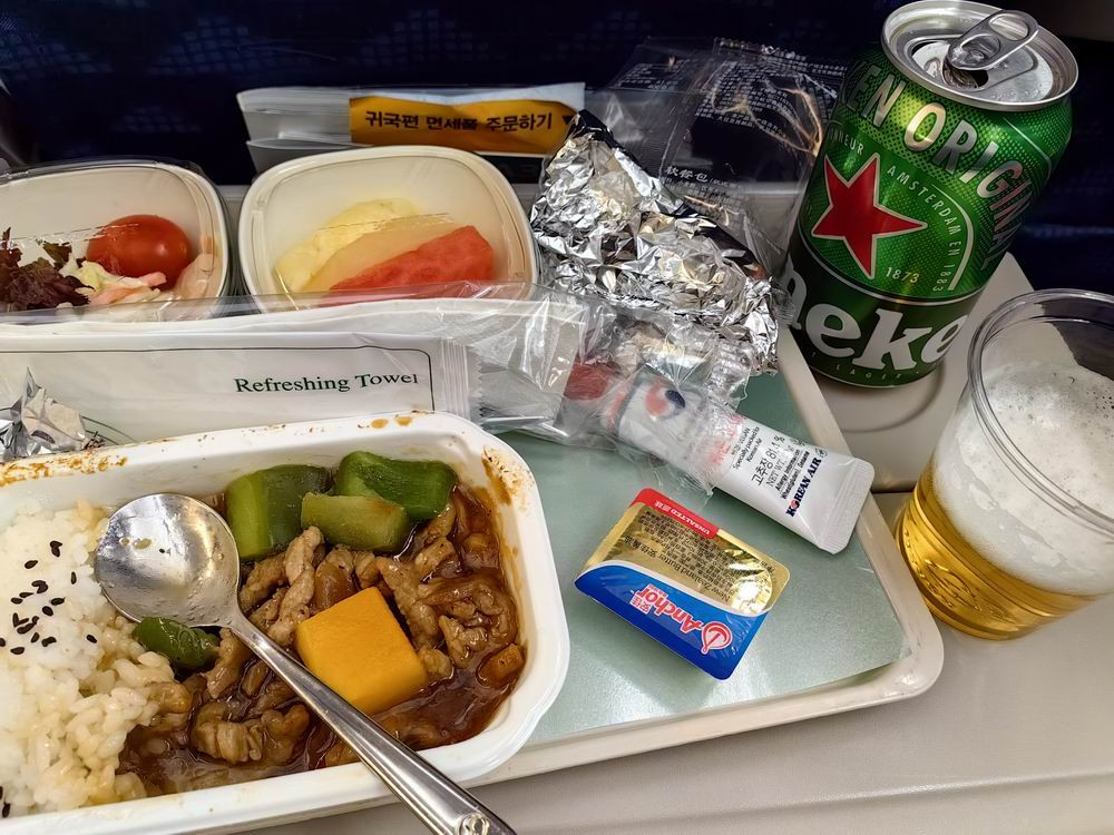 当地时间17:05,我们搭乘大韩航空KE085 航班,前往美国纽约。图为KE085 航班的飞机餐,比较适合中国人的口味。