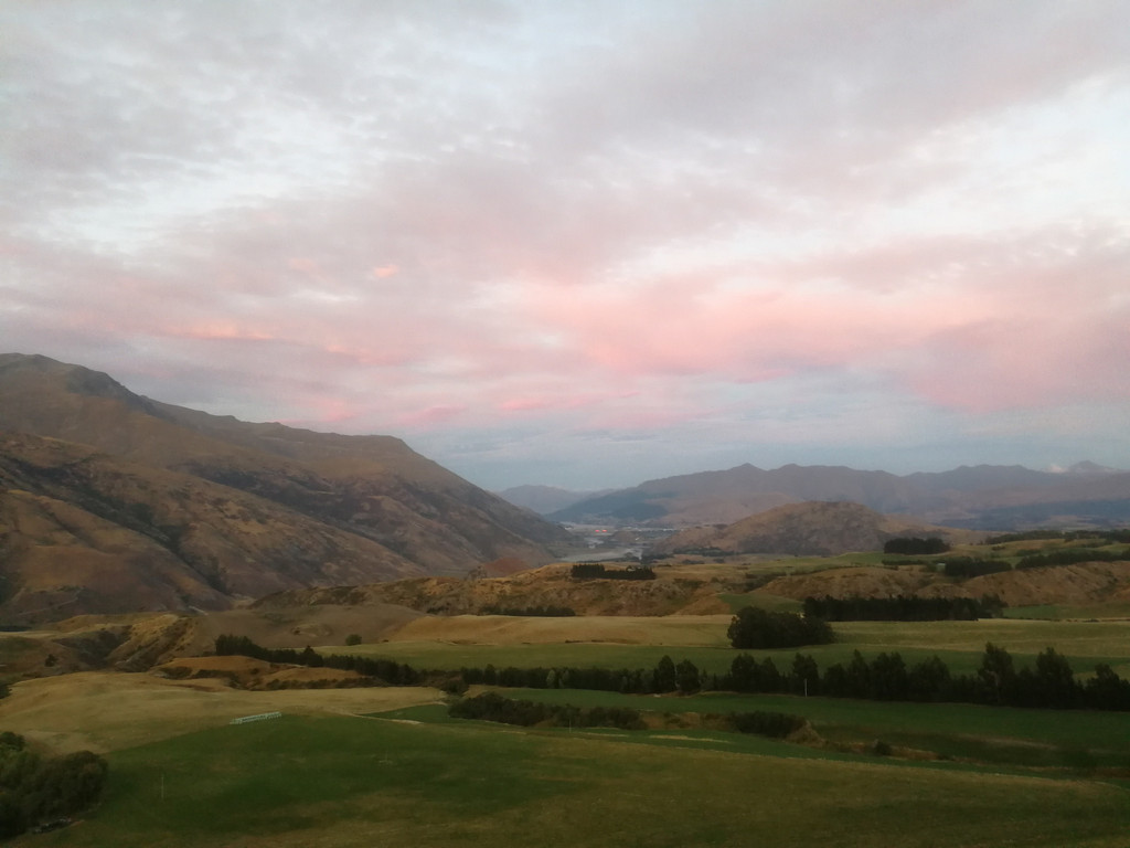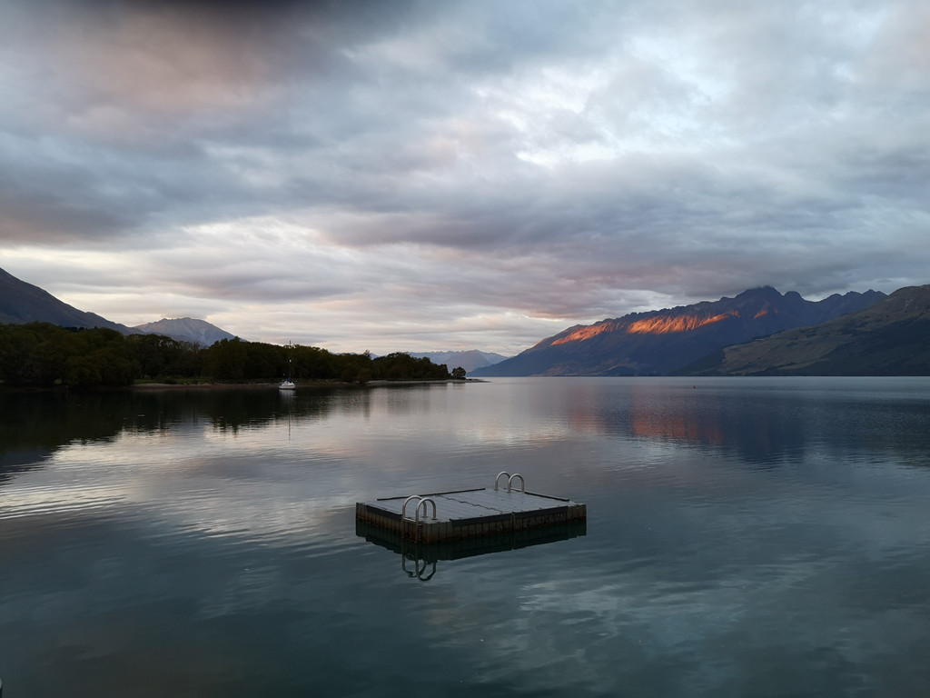 完成高空跳伞,把车停在瓦纳卡湖边,支起餐桌吃午饭,湖里有人游泳,跳水,男士们说要去游泳,我干脆睡个午觉,以抚平刺激后的心跳。午觉后沿着湖边开始寻找那棵长在水中的网红树。走了很远才找到,回头叫上先生,把车开来,躲在车上等日落。可惜当天的日落很一般没有霞光,一直等到7点半,天色昏暗,决定去镇上找吃的,然后在湖边过夜。但到了镇上,发现很多店已关门。公园入口处的停车牌上提示,所有游客不得在公园内过夜,包括房车。我们不再继续找吃的,决定到营地后解决晚饭。我以为瓦纳卡离皇后镇车程才一个多小时,又是著名的旅游景点,营地一定很多,但经过两个营地,都挂着客满的提示。继续往前,先生发现一辆警车跟在后面,打着闪关灯,提示停车。当先生说有警车在后面时着实把我们吓了一跳,因为房车车厢白天是座位,要求坐在后座的人也必须系安全带。到了晚上把后座一块板放下才是床,因为嫌天天铺床麻烦,后几天干脆也不收床了,累了躺着就能睡。先生这一声:有警车。你说可不把我们吓一跳,连忙跳起来把床上的东西一阵狂塞,手忙脚乱的把床板顶起来,因为里面还有床单枕头,床板哪里能卡的上,我们只好用背顶着,假装规规矩矩的坐在座位上。幸亏警察没有上车检查,只是在车边跟先生一阵叽里呱啦后就走了。先生说:今晚我们只能就地停靠了。我们的车后车灯坏了,警察说我们没有后车灯,不能开夜路,同意我们就地停靠。想起刚才的手忙脚乱,大家一阵狂笑。车停在路边,大家吃了一些面包,决定早早睡下。这时我突然想起取车时有说过这家公司可提供“24小时道路施救服务”,试着打了施救电话,一个多小时后施救人员赶到,跟先生说了几句后就走了,正奇怪,朋友问先生:是不是我们自己没开灯?先生闷闷的答:是。原来方向盘改为右边,车灯改了方向,先生不知道,跟警察说灯坏了,警察居然帮我们免去处罚,只是要求我们就地停靠。结果居然是没开灯,还闹了那么大动静,24小时施救都动用了,结果是个大乌龙。等施救人员离开后,大家又一阵狂笑。笑先生傻,笑逃过了警察的处罚,笑因祸得福,节省了当晚的住宿费。这么折腾着到了下半夜,第二天,天刚蒙蒙亮,路上车开始多了,为了安全,我们也决定向皇后镇出发。从瓦纳卡到皇后镇的路有7个像发卡一样的转弯,又是一路下行,一定要小心慢行。计划是第二天在皇后镇还车,时间还早一天,决定先去箭镇玩玩。