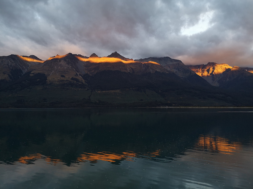 第二天七点多刚睁开眼,拉开窗帘,看到了日照金山的美景,拿着手机向湖边一路狂奔,只一瞬间,霞光变成了金色的丝带,环绕着山顶。湖边只有三两个拿着相机拍照的人,美景是留给有心人的。