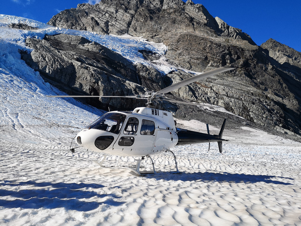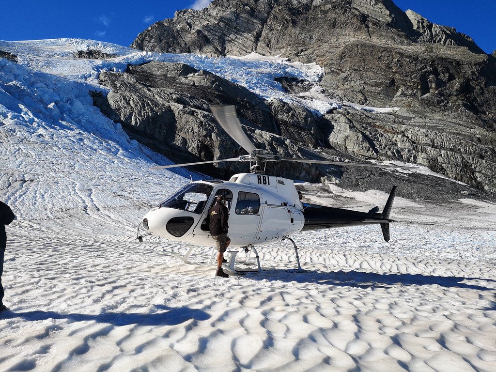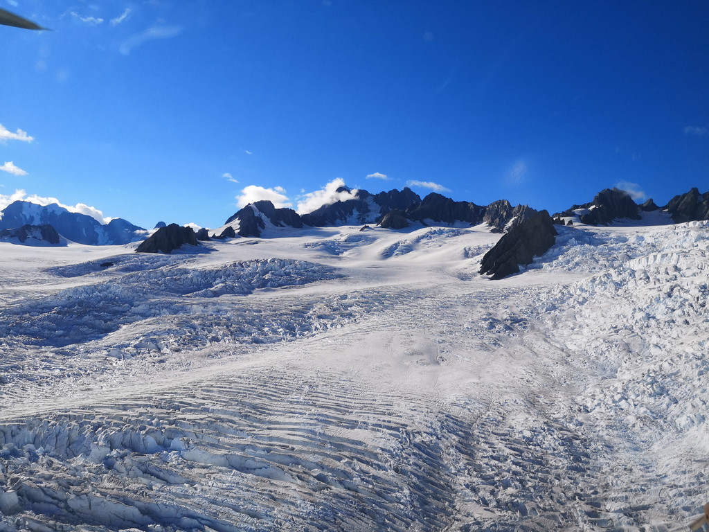 到了福克斯自然不能错过直升机加冰川徒步项目,因为行程安排失误,在携程上预定的凯库拉观鲸游船票没法退票,损失了一千二百元。之后所有的门票都不敢提前预定,但新西兰所有娱乐项目都需要提前预定,当天只能到镇上直接购买。由于语言障碍,我们找的这家只有直升机观光项目,没有冰川徒步。直升机观光线路有大中小环,我们选择了中环。任何线路都有降落在冰川上,零距离摸摸冰川上的冰,至于钻冰洞,看蓝冰之类的没有。在乘坐前工作人会重复三遍注意事项,然后带着大家步行到机场。整个环行过程大约一个半小时,驾驶员用英文为大家介绍所看到的是什么山,语言不通也听不懂,只能用眼看,有的山绿色的,有的山黄色的没有植被,有的山是黑色的应该是山体的冰川融化后的基体,融化后的雪水流入峡谷,变成了大大小小的湖,有绿色有乳白色,让人目不暇接。