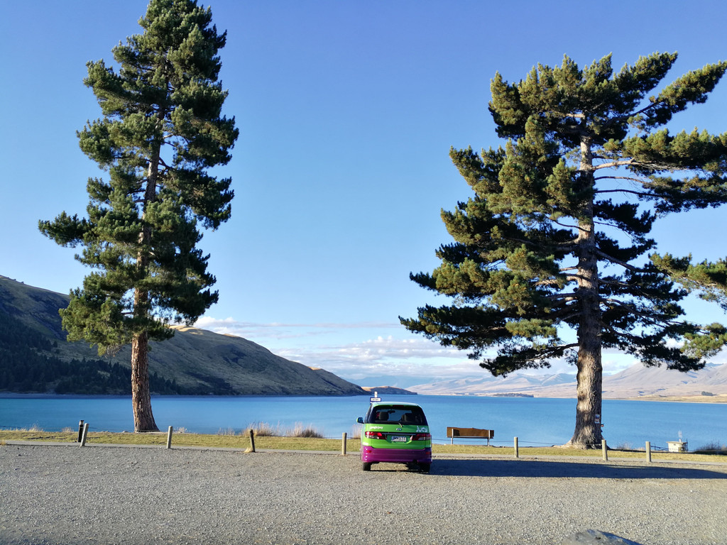 八点到基督城机场取车,租房车的游客很多,感觉大家都不急不慌的,租车点提供很多营地导图,和免费的咖啡供应。我们也只好倒了一杯咖啡慢慢等待。接待员先是递了一份交规试卷,测试60分才算通过。试卷很简单,回答完毕交给接待员,带我们去看车。看到车才发现说好的有卫生设备的,其实只是一个简易马桶。先生看中了有卫生间、淋浴房的房车。要接待员帮忙调整车型,等待期间大厅有播放房车设备使用方法的录像,但大家心思都在是否能更换成功这事上,而没有认真观看,以至后来连燃气灶都不会使用。所以房车设备使用方法的录像应该用心观看,如果有卫生间、淋浴房的房车,如何加水,如何排污都应该认真做个记录。我们最终没能更换到有卫生间、淋浴房的房车。先生只好悻悻开着不满意的房车出发了。后来实际证明,卫生间还是有必要的,淋浴房倒无所谓。在新西兰所有车辆夜间都必须停靠在营地。营地有收费和免费的,收费营地根据提供的服务、设备的齐全分成星级。我们没有特意选择什么营地,碰到哪个是哪个,所以3星、4星、5星都住过,按人头收费,每人N币20-40不等,有的营地收取费用后淋浴就不再另外收取,但有的营地还需要投币才能使用限量的热水供应。收费营地厨房功能都很强大,足够多人同时使用。大家使用完毕都能自觉的将餐具清洗收拾干净,星级越高,人员素质越好,大家都安安静静的忙碌着,走的时候各自清理好自己弄脏的台面。至于那些免费营地,我们只是在路过时停靠休息一下,只有必要的公厕,没有提供电源,饮用水。很多当地人开着房车停靠在免费营地,那个房车配备了太阳能发电设备,有线接收器,有客卧之分,其实就是一个移动的房子。这样的房车看的我们直流口水,这才是房车的最高级别。拿到车,连车行提供的导航都没认真学,本以为使用手机导航根本用不上车行提供的导航。事实证明,事先让车行将计划要去的地点存在导航内是很有必要的。新西兰很多地方根本没有网络没有信号,最后是一份租车时随手拿的纸质TOP10营地导图救了我们,以至于这份导图回来时已经被翻得稀巴烂。