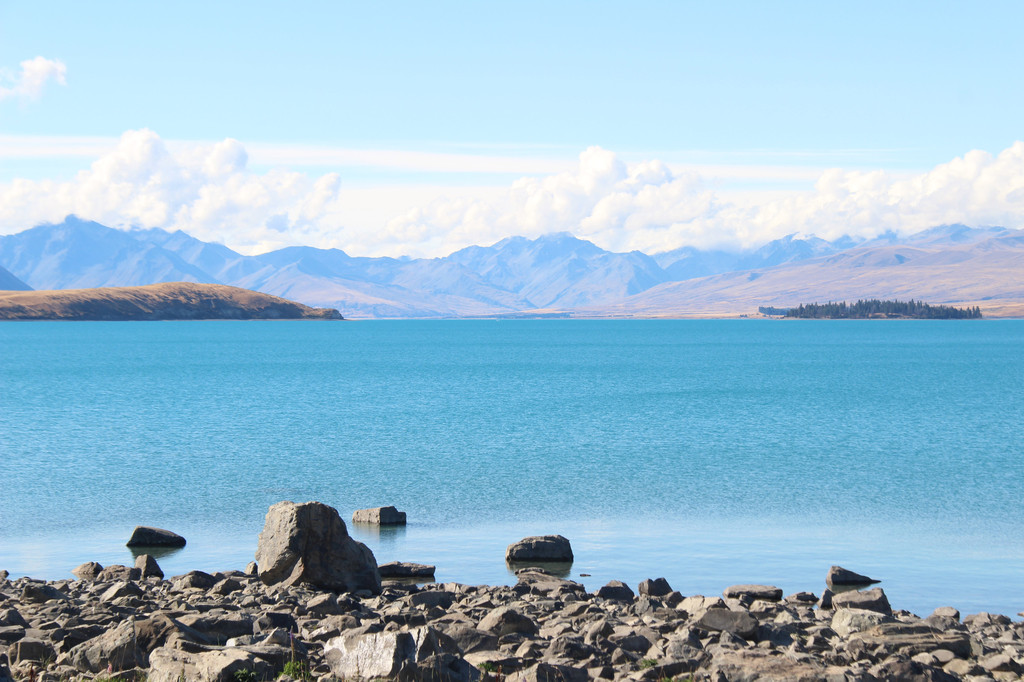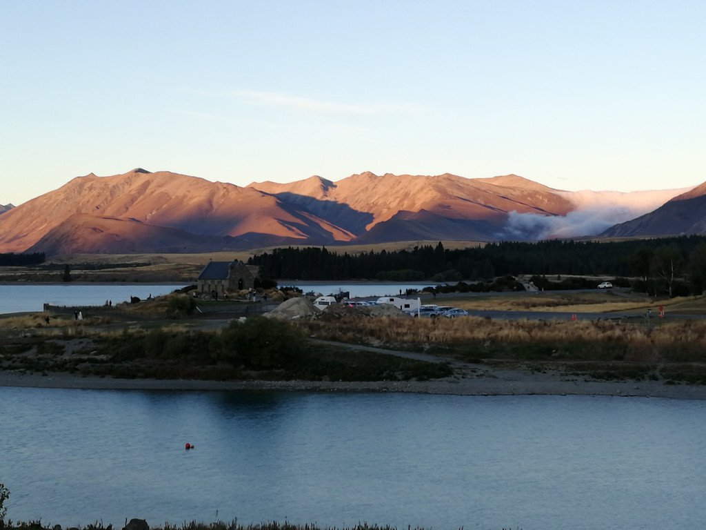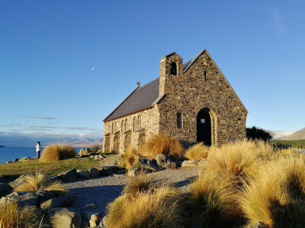 从基督城到特卡波,导航显示2.5小时,攻略上提示3.5小时,但我们足足开了5小时。回来翻看地图,才发现通向特卡波湖的路线非常复杂,手机导航一旦没有信号就无法提示转弯、变道,当我们想着就地扎营时看到了一个在路边的介绍牌。目的地就在前方。开着开着,车子转个弯,突然一片艳丽的蓝色映入眼帘,我想这一定就是特卡波湖了,可好牧羊人教堂在哪?湖边立着一只牧羊犬雕塑。往人多的地方继续走一会儿,好牧羊人教堂沐浴在阳光下,教堂应该是五点关门,赶在关门前进去转了一圈,一个很小的教堂,几张椅子,一个小小的神坛。教堂临湖的墙是一块大大的玻璃墙面,特卡波湖尽收眼底,鲜蓝的湖水,金黄色的山脉,湛蓝的天空上飘着几朵白云,在这里无须祷告,只是坐着就能让人心静如水。特卡波小镇边上的营地等待入住的游客排长队。这自然是先生负责的,我背着相机又步行到小牧羊人教堂,等待日落。一直到7点半天空已经开始昏暗,先生开始催着我回去吃饭。小牧羊人教堂前开始有摄影人员占位,等待拍夜里星光。同行的伙伴都没这个兴趣,早早睡去,我夜里起来抬头看着夜空,果真银河清晰可见。但营地离小牧羊人教堂步行需要40多分钟,一个人也没这个勇气,只好对着天空随便拍了几张,回来在电脑上银河还是能看见的,只可惜没有小牧羊人教堂做背景。