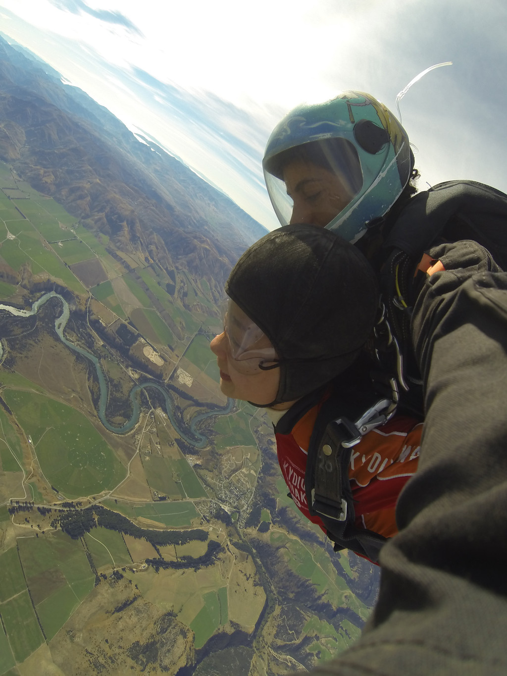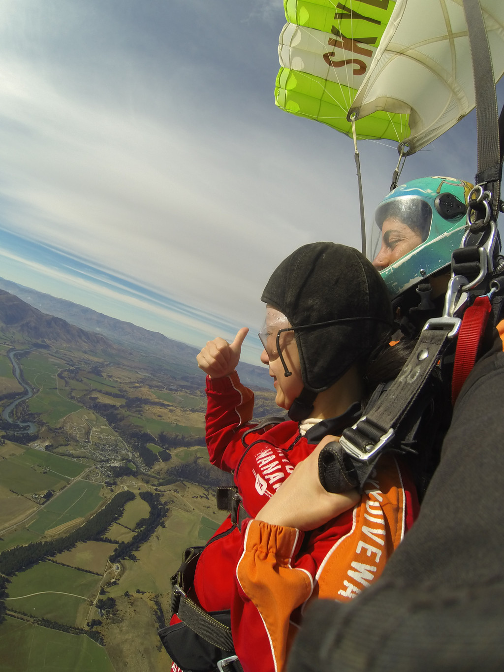 跳伞是我此行的计划之一,所以心里早有准备。跟我们一同跳伞的一共有6位,飞机在高空盘旋,先让大家欣赏瓦纳卡风景,教练帮忙给坐在前面的学员戴上氧气面罩。然后每个教练都开始把自己跟学员用卡扣固定在一起,脑海里突然有点担心,万一卡扣没卡牢怎么办,降落伞可是在教练背上,如果卡扣脱落了,我有能力抓住身后的教练吗?看着其他人一个个跳出机舱,心跳开始加速,当我跟教练缓缓移到机舱口时,紧张是难免的,教练让我把头贴在她的肩上,然后就这样被教练带出机舱。想起刚看的视频,连忙做出“香蕉”姿势,人真的感觉在天空中飞翔。一会教练拍拍我的肩膀,暗示我可以保持放松姿势,这时感觉身体正在高速下坠,心往下沉,瞬间降落伞安全打开,这时教练竖着大拇指,给我一个鼓励的手势,我也朝她竖起了大拇指,同时我们在高空中握了一下手,算是对她的感谢。她操纵着降落伞左右翱翔,带我旋转一圈,让我可以360度欣赏着瓦纳卡的风景,这时离地面越来越近,似乎下降也开始加速,又开始有总不安全的感觉。当教练拍拍我肩膀,我连忙采取坐姿,伸直双腿,随后安全着陆。坐在地上,有点蒙,教练伸出手拉我起来,同时我还她一个大大的拥抱。此时我的耳朵刺痛,落地好长一段时间才恢复。下来后在休息区等待领取视频,至此高空跳伞圆满完成。刺激,回看视频,居然手心还会出汗。