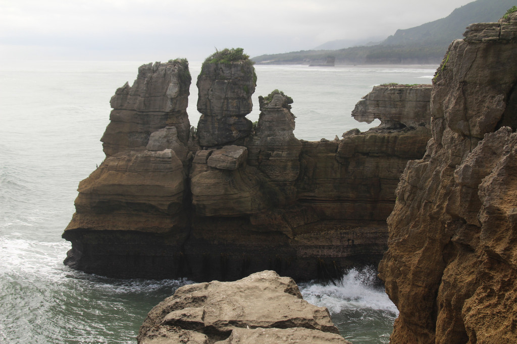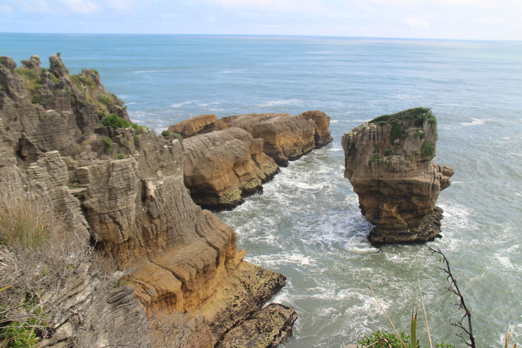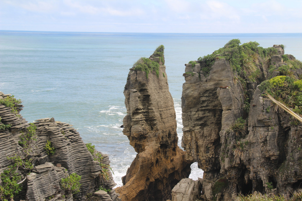 从营地很快到了格雷茅斯小镇,转了一圈没有找到千层岩景点。问了居民,说是继续往北开,但开了很久远远的看到一些岩石,先生着急着吃午饭,指着远处的岩石说那应该就是。我找出携程的景点照片给他看,告诉他今天不找到这个景点我不回去,现在可以先吃饭。(经过这几天的使用,房车的好处渐渐凸显。每到一个大的小镇就去超市补给,一个冰箱的食品够吃3天。每天晚上入住营地煮好晚餐就把第二天午餐一起准备好,第二天经过一个风景优美的地方,停车,支起餐桌,椅子,午餐用房车上的灶加热一下,可以美美的吃个午餐,有时实在太累,还可以睡个午觉。晚上在营地,四个人刚好一瓶葡萄酒,这日子过得别说多惬意)吃过午餐,通过手机导航终于成功的找到千层岩,这是一个国家公园,难得看到很多的游客。先生长舒一口气,千层岩真的就像千层糕似的层层叠叠,耗时寻找是值得的。晚上入住福克斯冰川小镇。