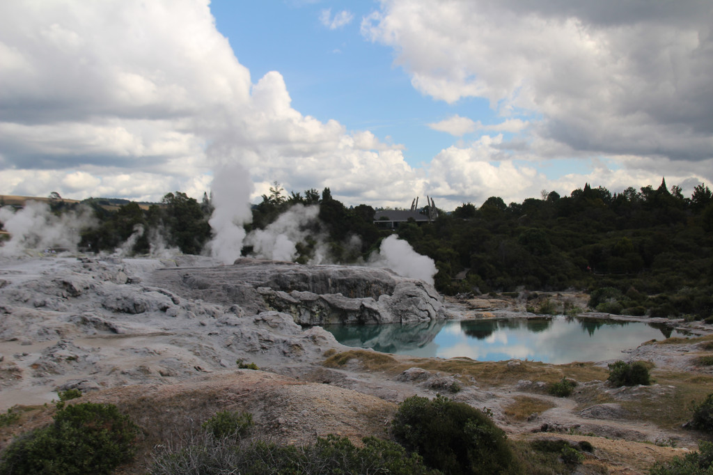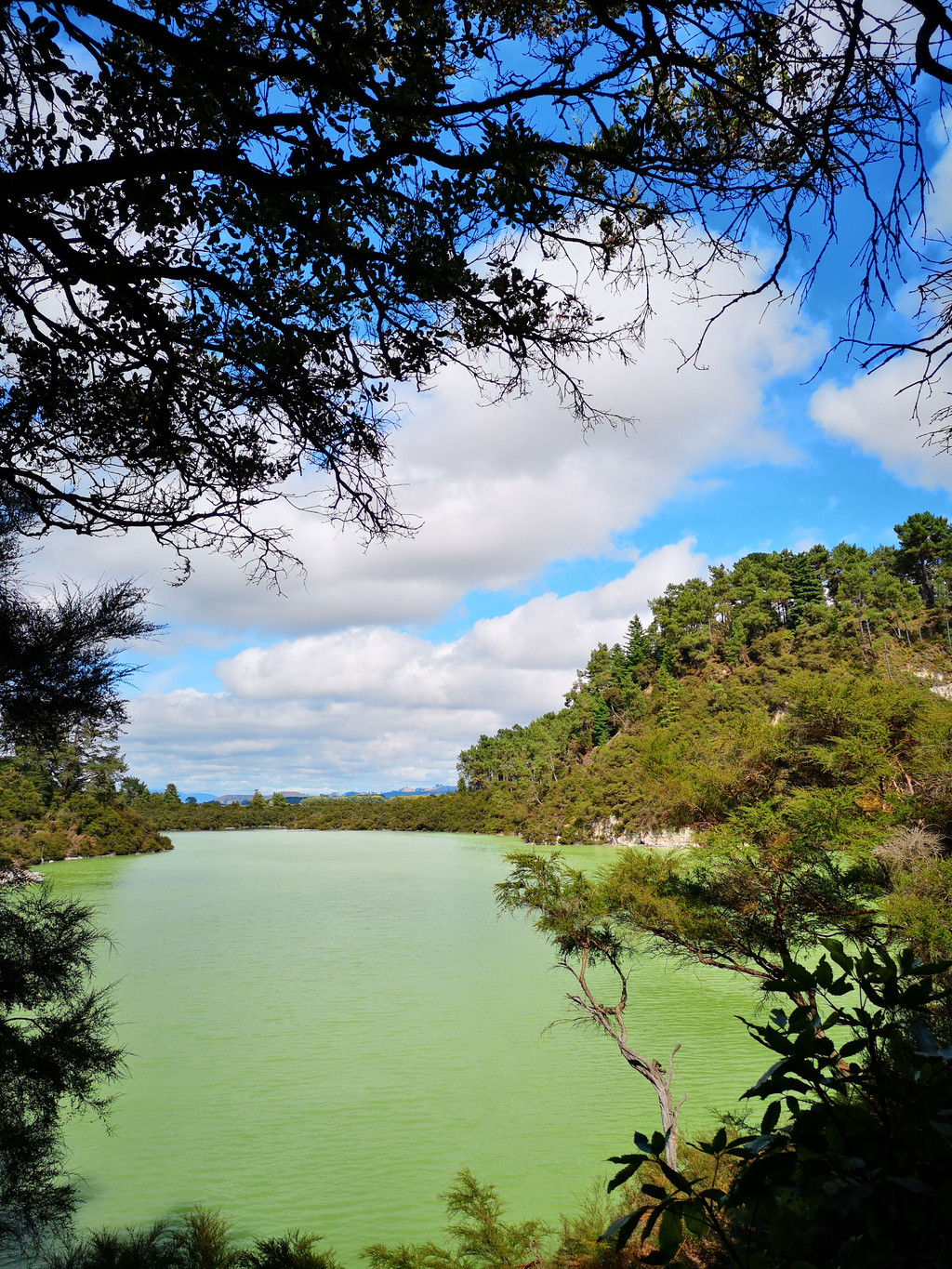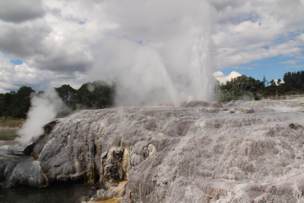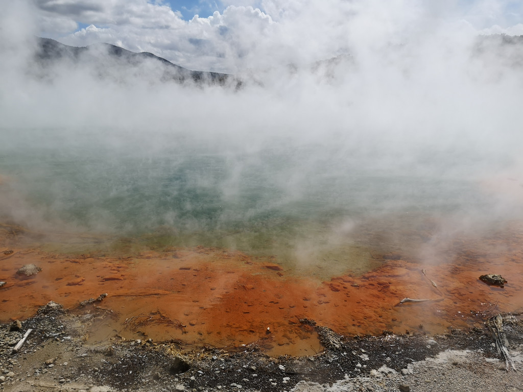 地热仙境是此次北岛的重头戏,美国有个黄石公园,新西兰的怀欧塔普地热仙境又称为“小黄石”。整个公园慢慢走大约3、4个小时。一路地热不断在冒着热气整个公园如同烧水的蒸锅,空气中有硫磺味,最有名的就是香槟池了,像一口大蒸锅,边缘有橙色的泥土把水染成香槟色。还有嫩绿色的池水,是水中丰富的微生物造成的。当然还有黑色泥浆池,黄色的硫磺山。有个诺克斯女士间歇泉每天上午10点左右开始喷水,在刚入口的另一条道上,等我们返回时询问公园的工作人员才知道,这个间歇泉每天就喷一次。我对没有看到间歇喷泉耿耿于怀。