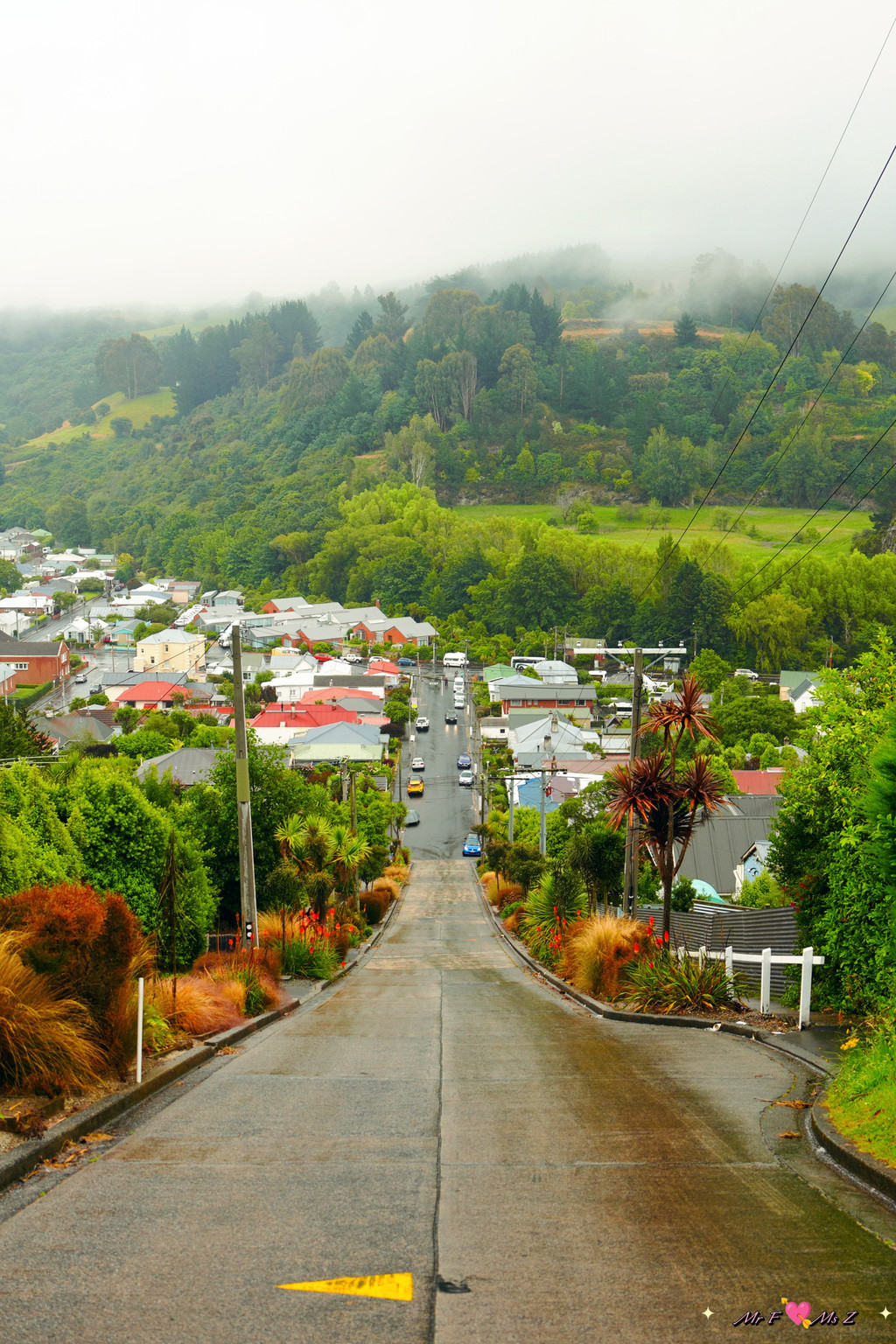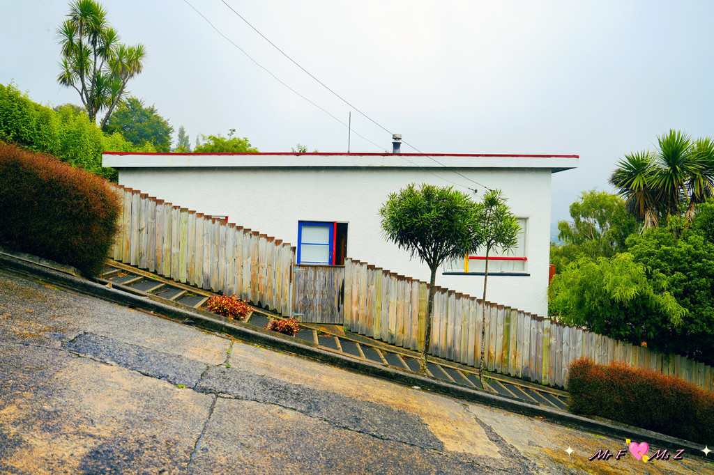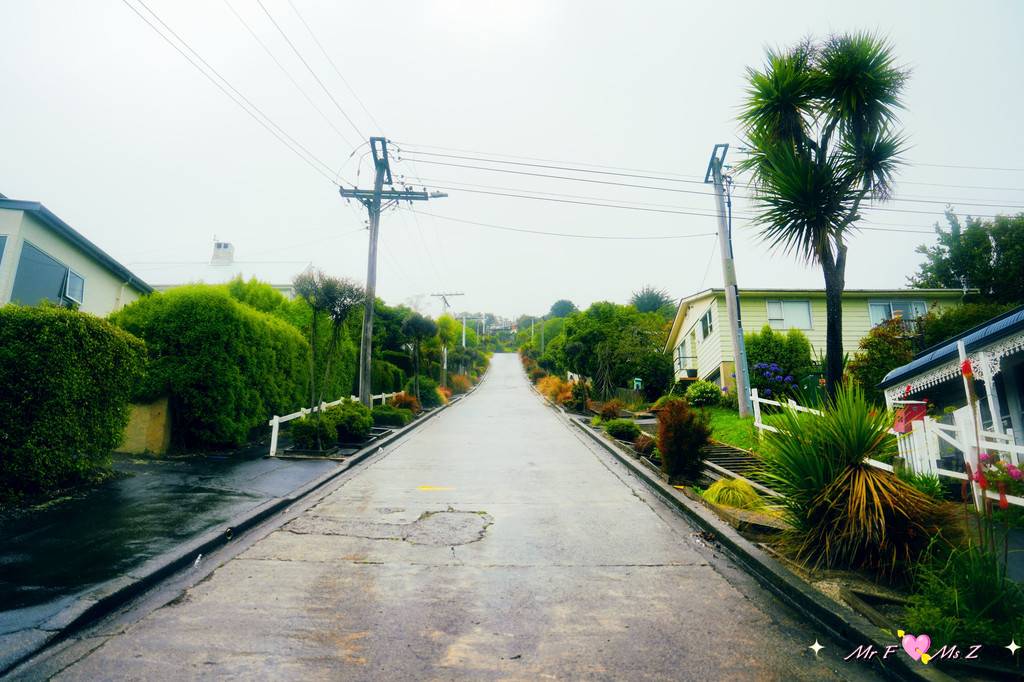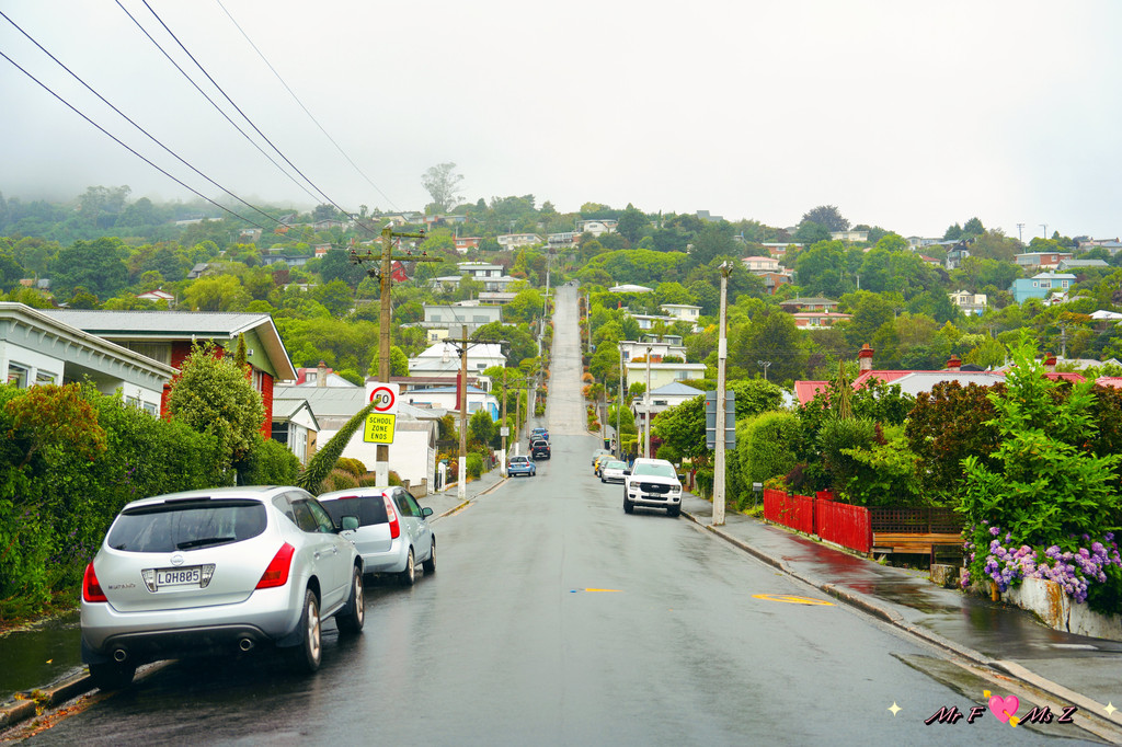 离开富有历史感的校园,我们前往今天的第三站——鲍德温大街。此时,雨越下越大。19世纪末,但尼丁的一名城市规划师在未实地考察的情况下,“纸上谈兵”般地绘制了这条街道的布局,却意外造就了如今载入吉尼斯世界纪录的“世界上最陡峭的街道”。