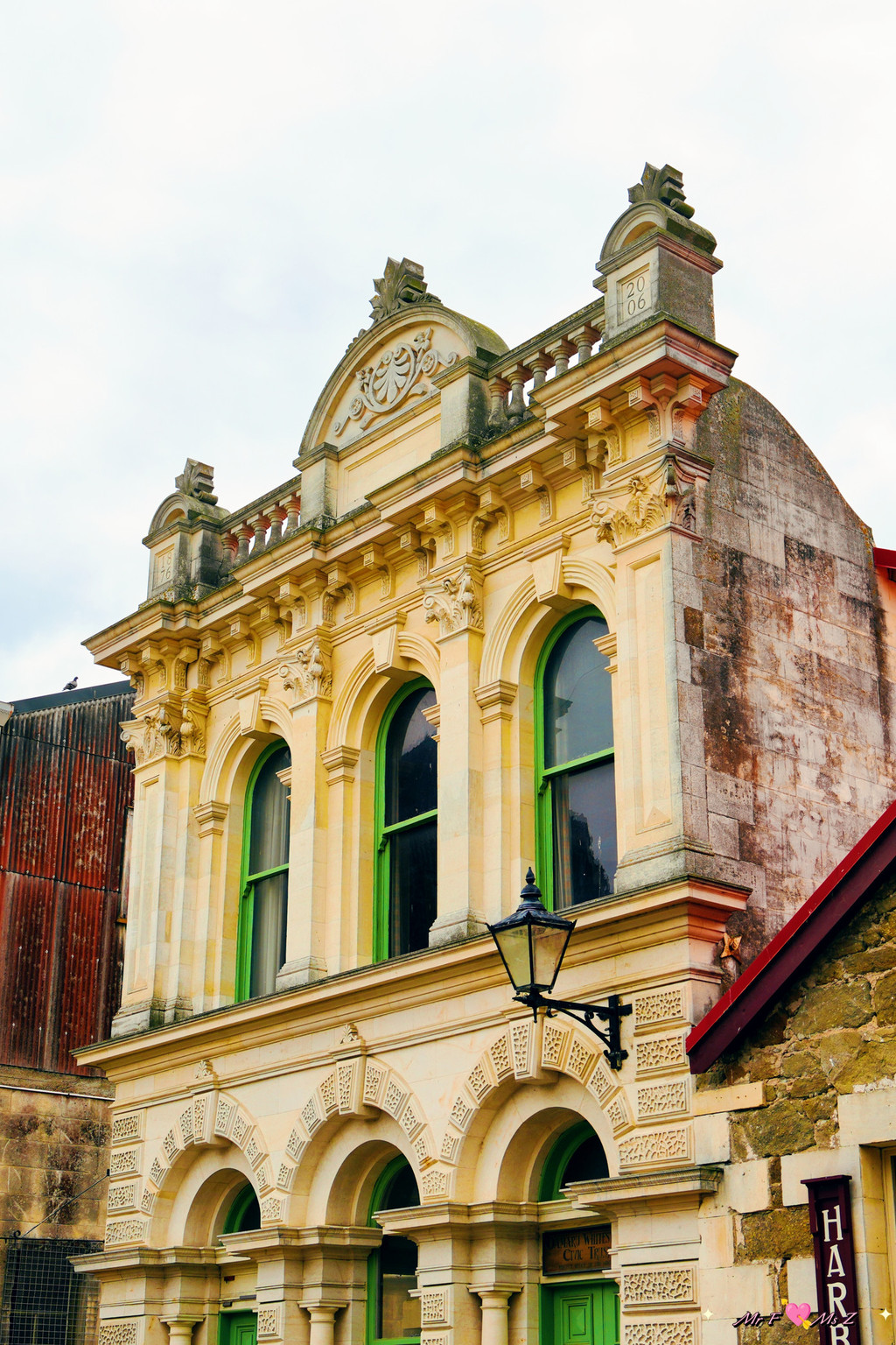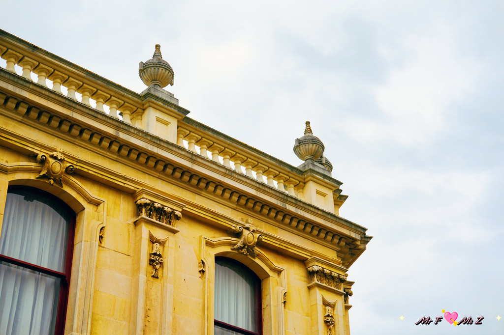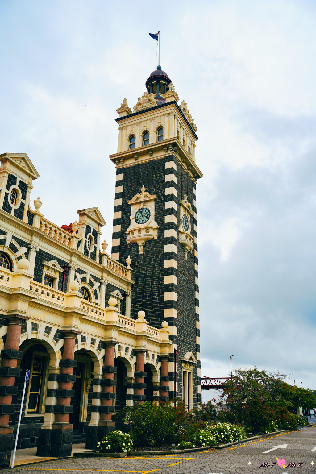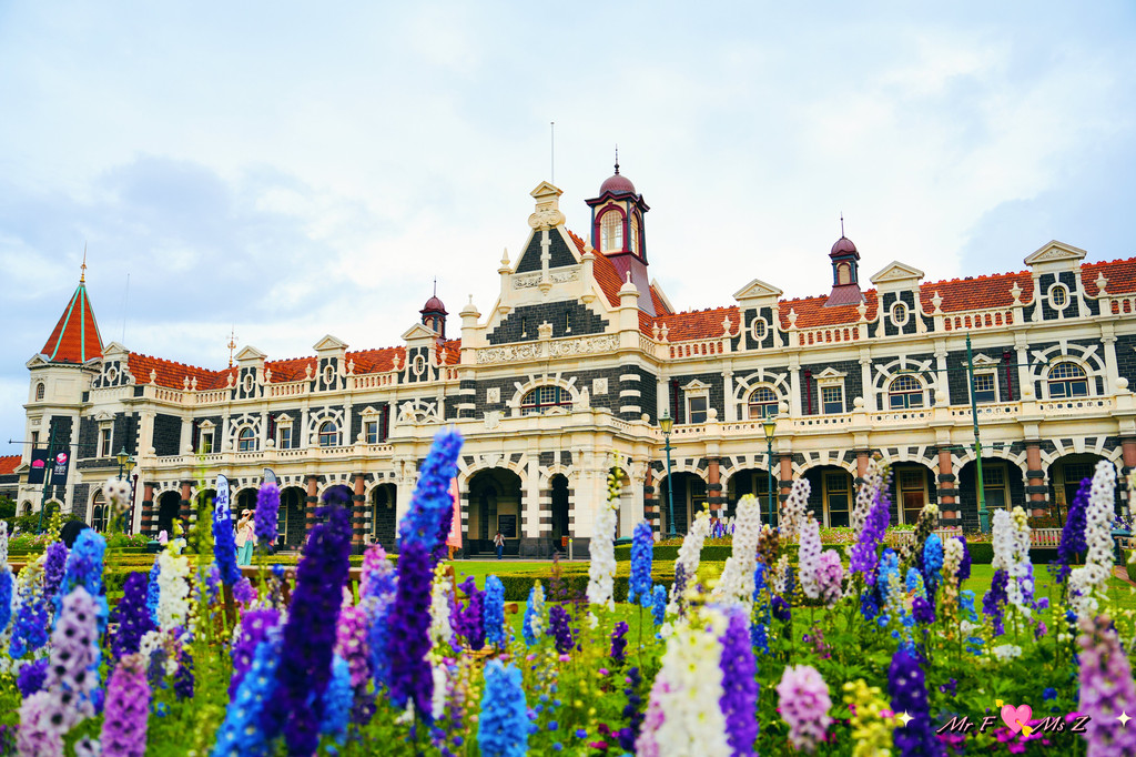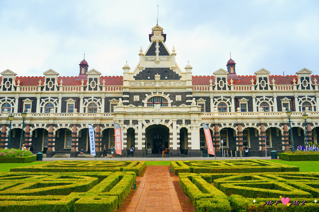 颇具佛兰德文艺复兴(Flemish Renaissance)风格的但尼丁火车站建于1906年,以其规模恢弘的外观和富丽堂皇的内部装潢而闻名,被公认为新西兰最美丽的火车站。我们到达时,天空偶尔飘着细雨,浅色的奥马鲁石(Oamaru stone)外墙在阴天的映衬下显得格外柔和。