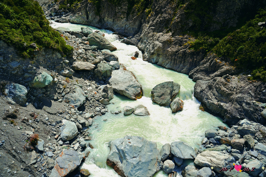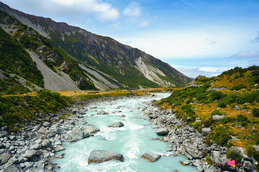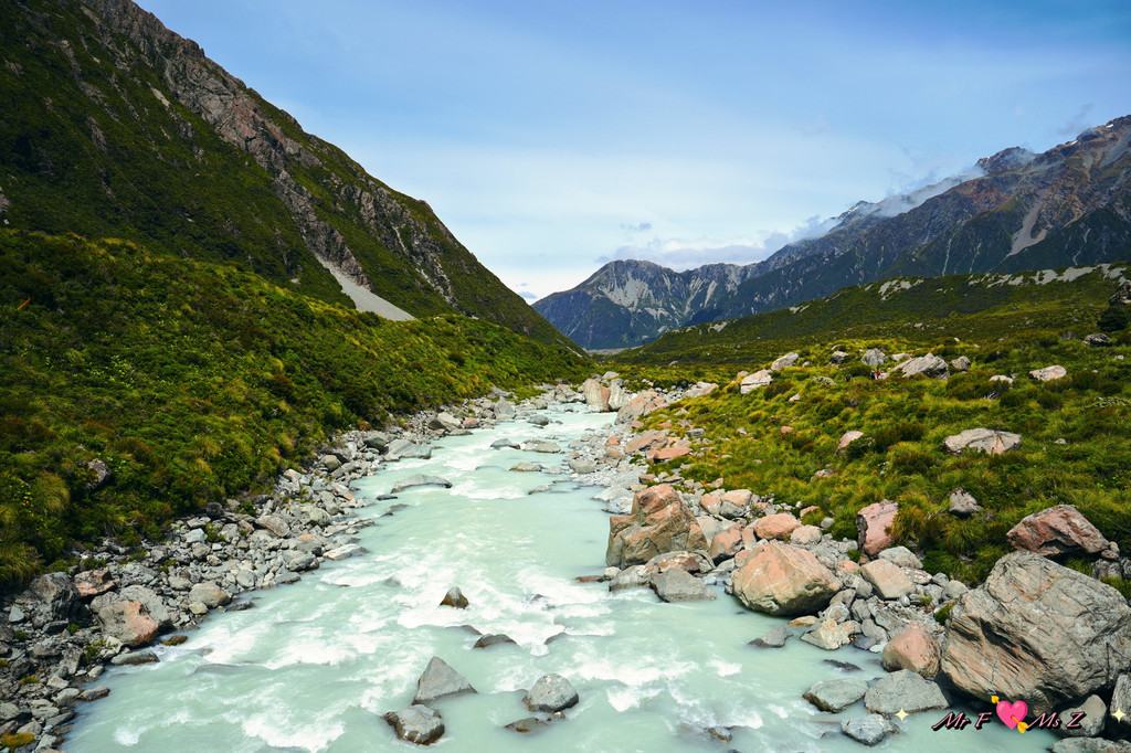 塔斯曼河如一条蓝色的丝带穿梭于河谷之中,两岸绿意盎然,野花点缀其间,偶尔还能看到成群的牛羊在悠闲地吃草。这里的空气清新而湿润,带着一丝青草与泥土的芬芳,令人心旷神怡。